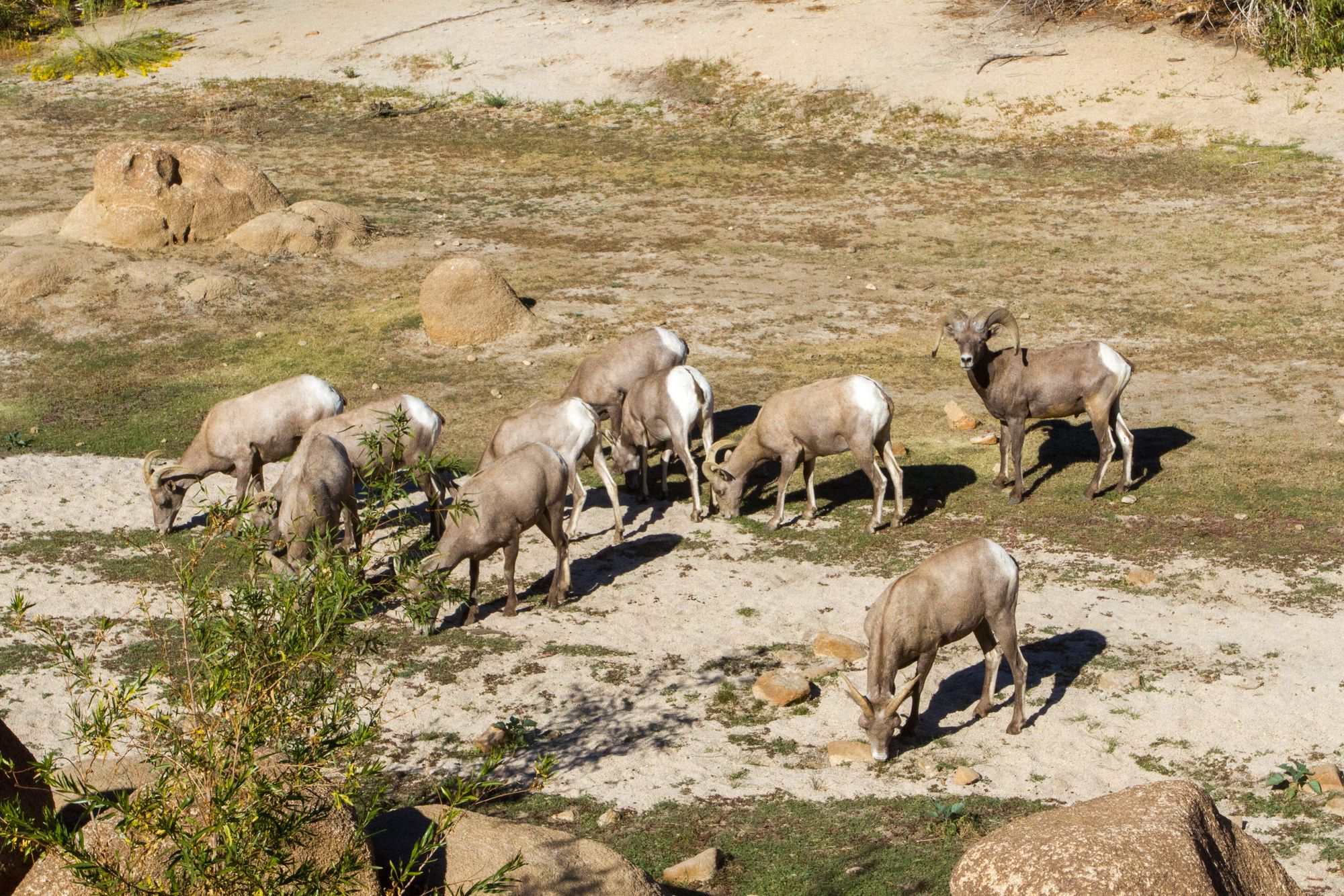 Left: Rock-lined path. Center: Barker reservoir with some water. Right: Desert Bighorn sheep.
