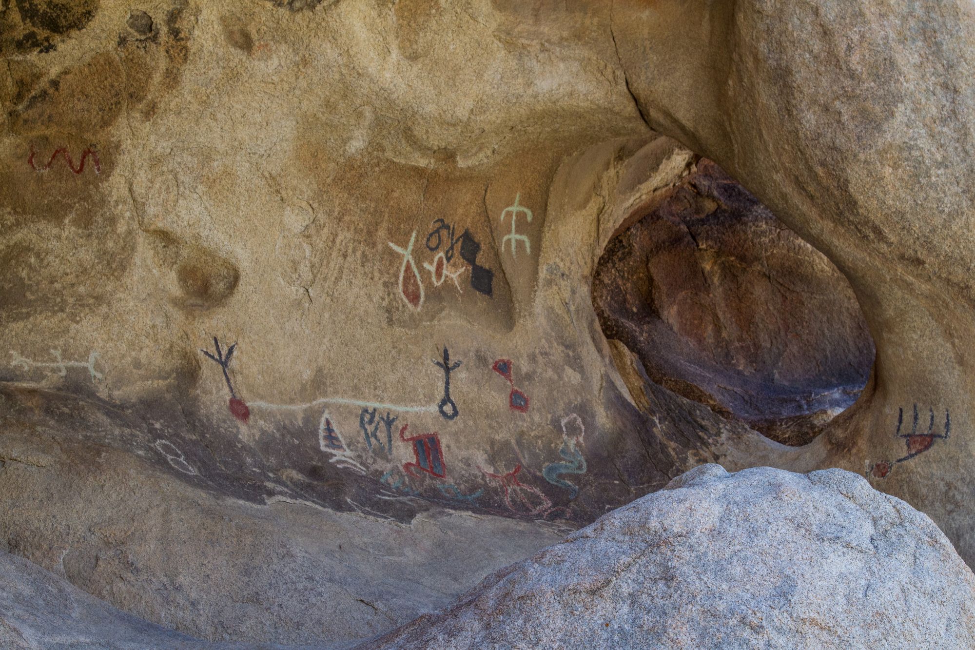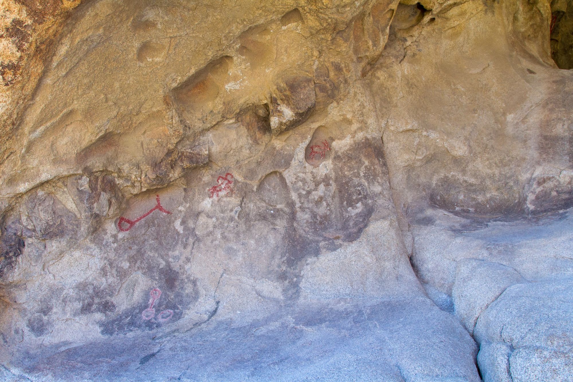 At the far end of the flat and tucked inside the alcove are a set of artificially painted pictographs known locally as the “Disney Pictographs.” These were once a set of authentic petroglyphs, probably of Serrano origin. It is reported that in 1960, A film crew contracted by Disney for work on the TV episode Walt Disney Presents: Chico the Misunderstood Coyote painted over the original faint petroglyphs to be able to see them better and added some of their own for effect. The damage, of course, is irreversible. Never mark or touch rock art. Still, this is an intriguing site.
