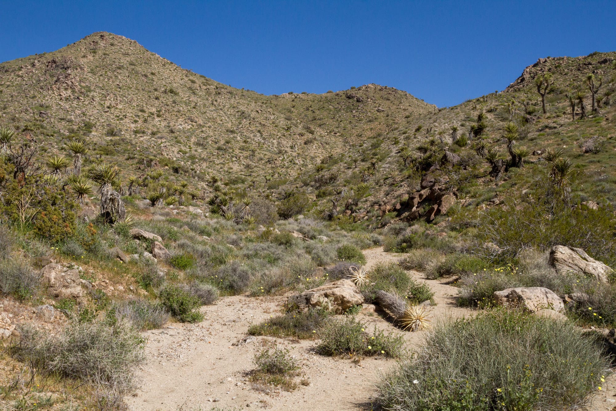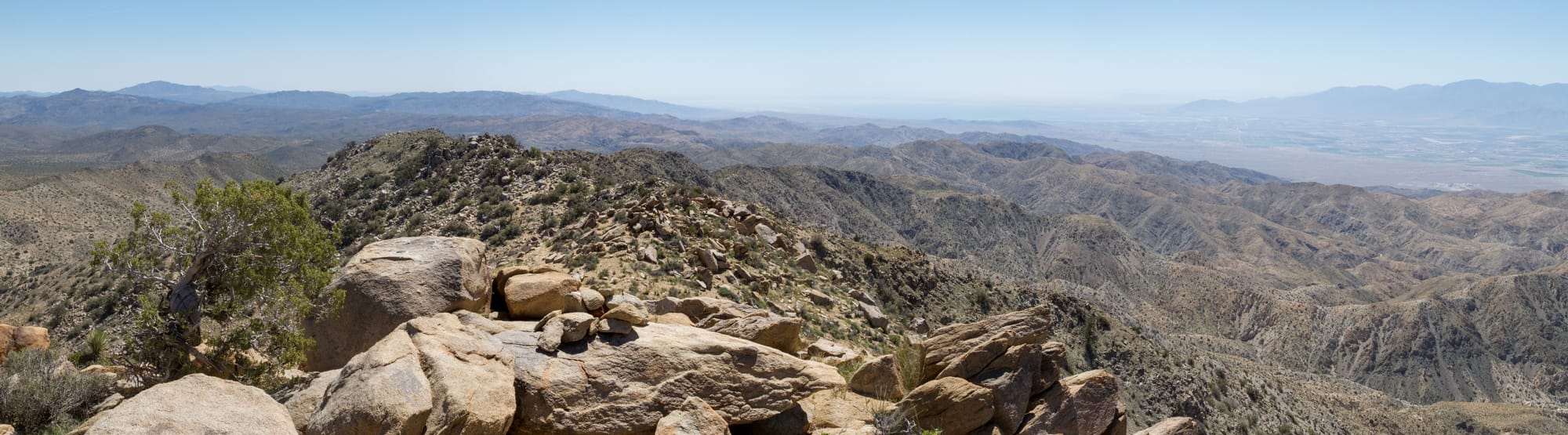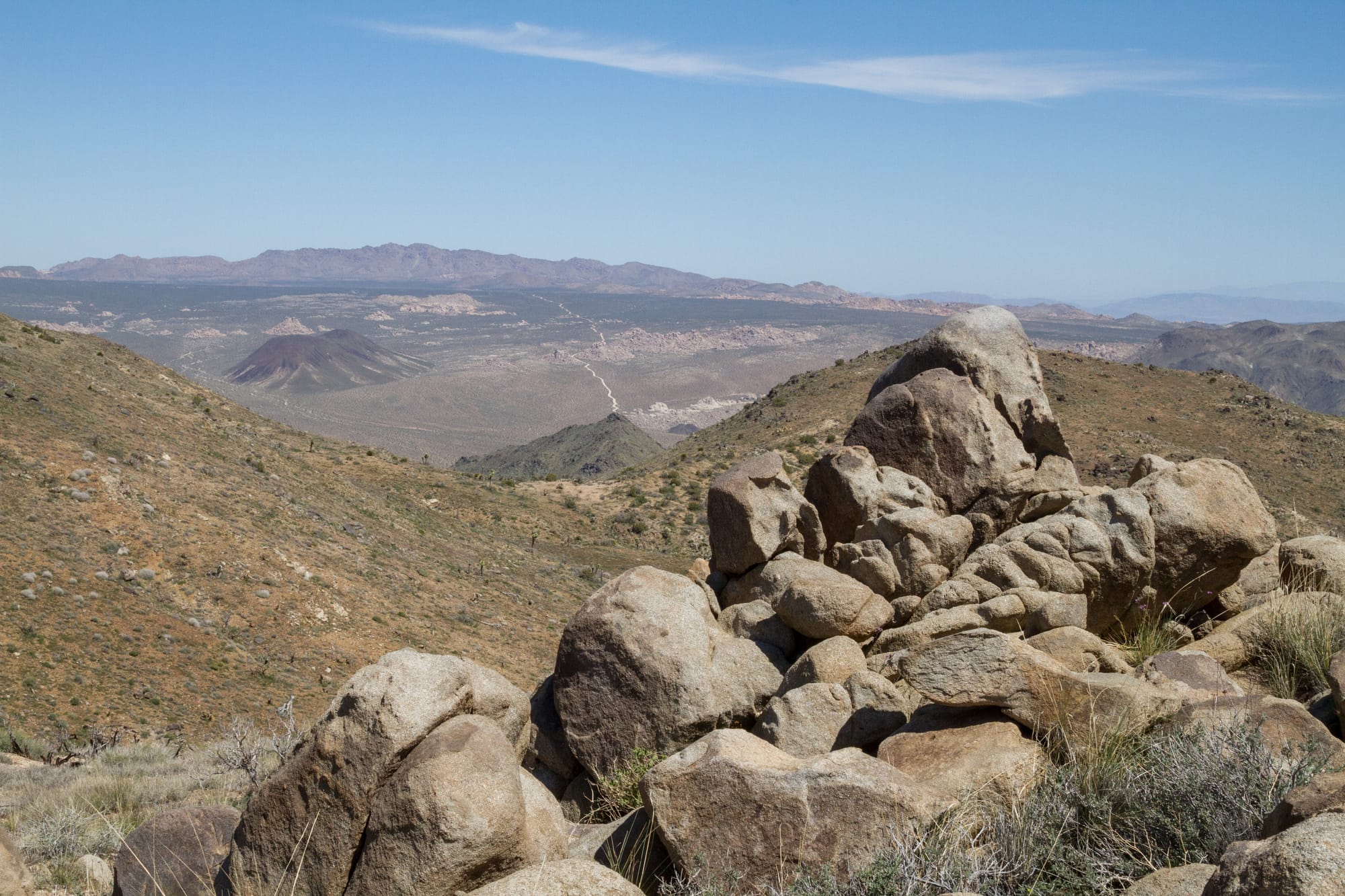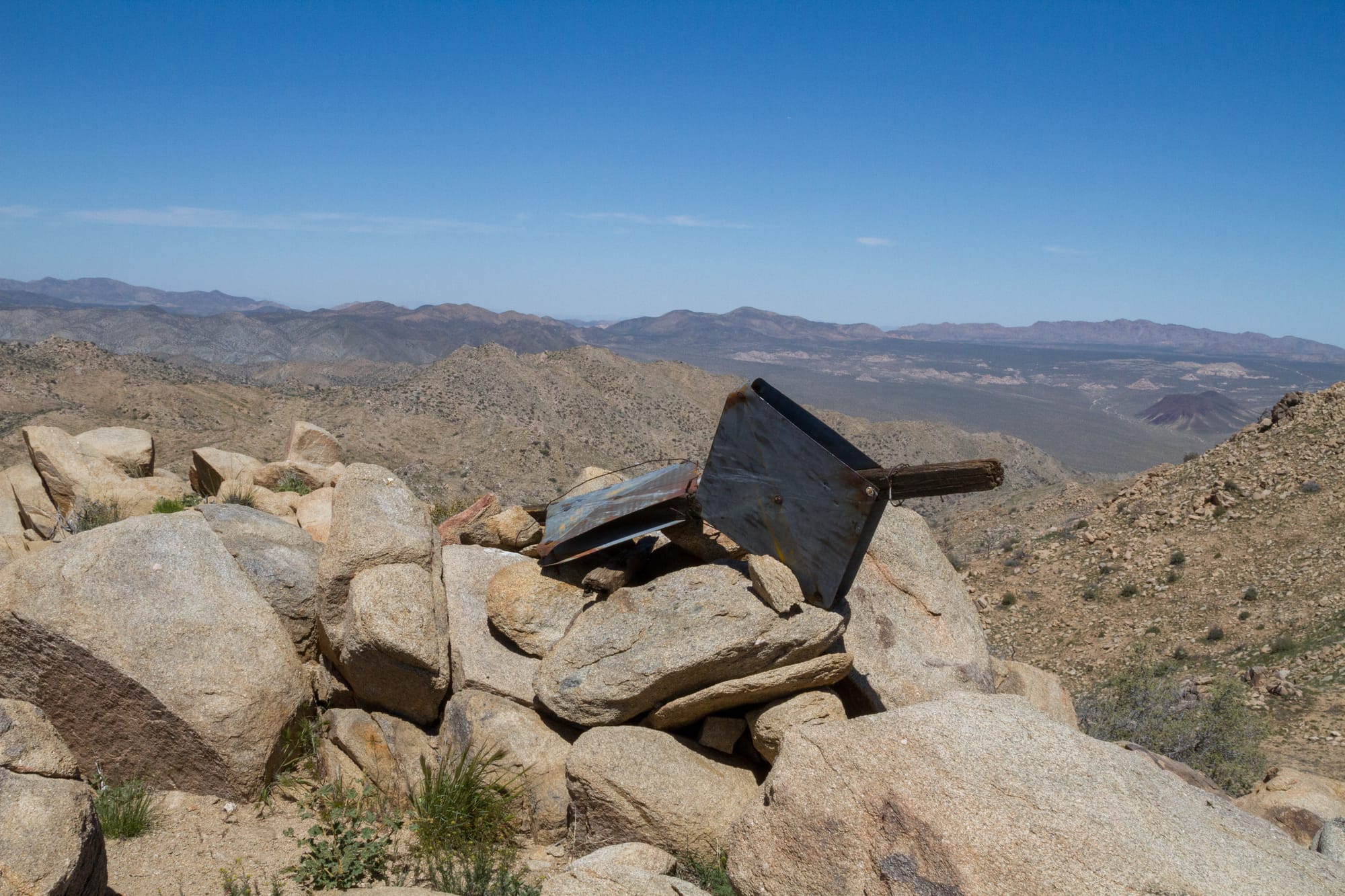 Down below, but not visited on this trip, are the ruins of Berdoo Camp. Established in 1933 as a base for workers constructing the massive Colorado River Aqueduct project, this short-lived settlement once housed over 150 men in dormitories and cottages. It even boasted a state-of-the-art 35-bed hospital complete with air conditioning. Nothing of the camp remains today. However, the Metropolitan Water District erected a triangulation station on Little Berdoo Peak as part of surveying for the aqueduct in 1931, which you can see traces of today.