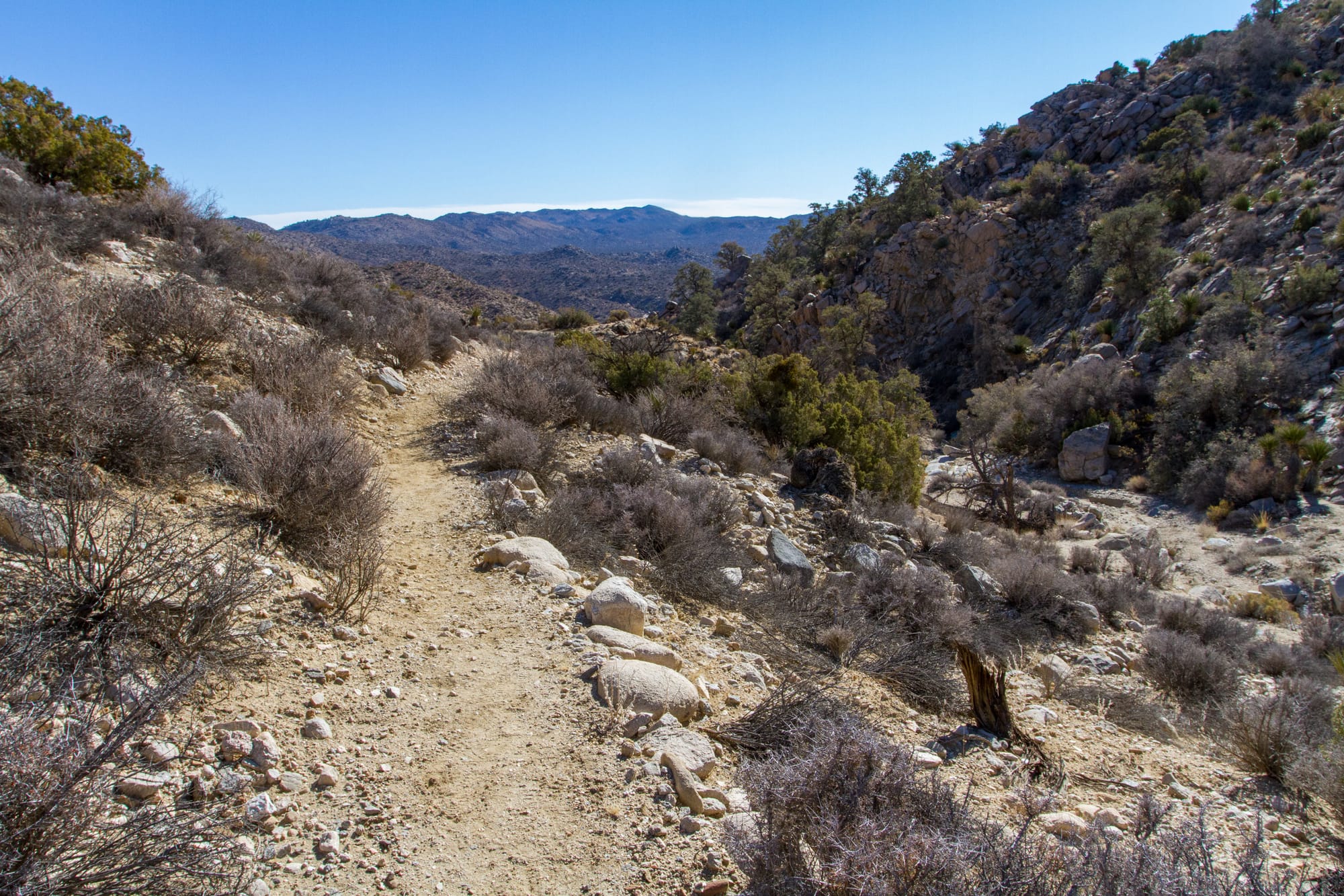 This challenging section is perfect for a full-day hike. It immerses you in the park's untamed beauty and wilderness, transitioning from pinyon-juniper woodlands to open desert flats. It's unlikely you will see anyone else on the trail for the first six miles. The trail begins by winding through pinyon- and juniper-covered hills and then drops down into the upper reaches of a little valley. Most of the geology here is granitic granodiorite or quartz diorite from the Cretaceous era. At 1.6 miles in, you will pass a trail junction, which heads down to the Lower Covington Trailhead, but you will want to continue straight ahead on our trail, which climbs the rest of the valley to a pass. Quail Mountain (the tallest in the park) looms to the east. The trail then drops 800 feet into a dry, unnamed valley, turns east, and climbs 600 feet back out. At 6.2 miles in, you will emerge onto the Juniper Flats woodland. The trail becomes much easier from here on out.