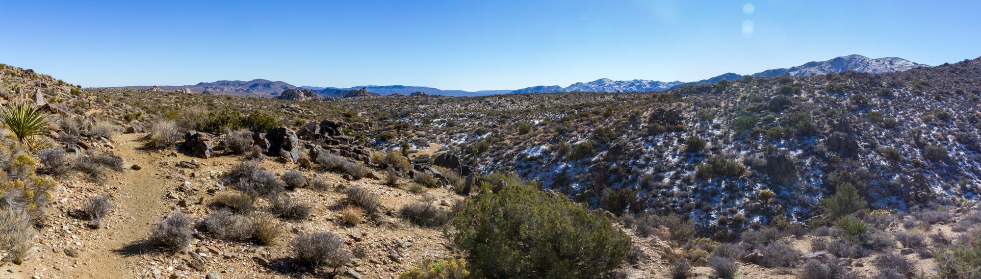 This final section of the hike is by far the easiest of the three trail sections. The trail traverses the vast expanse of Queen Valley, providing views of the wide-open desert vistas as it transitions from the Mojave to the Colorado Desert. The vegetation shifts from Joshua trees and junipers to creosote bushes and cholla cacti. This segment ends at the Twin Tanks Backcountry Board trailhead. White Tank Campground is located just a half mile away.