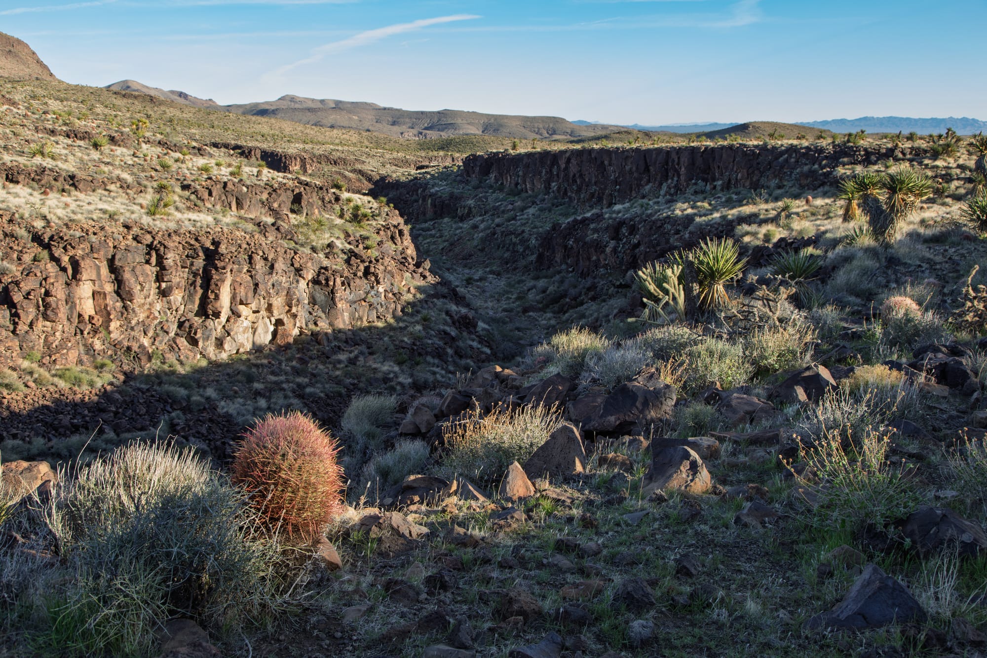 Most East Mojave rock art sites have a mix of abstract designs, the occasional bighorn sheep, maybe a few human figures. This canyon has those too, but what sets it apart is the number of enclosed crosses pecked into the basalt cliffs. I didn't name it, but whoever did had good reason. The crosses aren't the only things worth looking at. A repeating mask design shows up on the rock, sometimes with two dots, sometimes four. And in a side canyon at a tinaja (natural water tank), there's what looks like a thunderbird and a possible cougar.