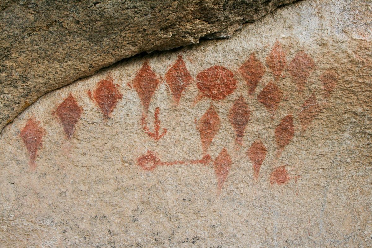 Nestled in the Wonderland of Rocks and just around the corner from Alister's Cave in Joshua Tree National Park is another rock shelter with pictographs: the Diamond Solstice Pictographs. The main symbols here are a sunburst arc, diamonds, and diamond chains. Their meanings have been lost to time, but there are some theories.