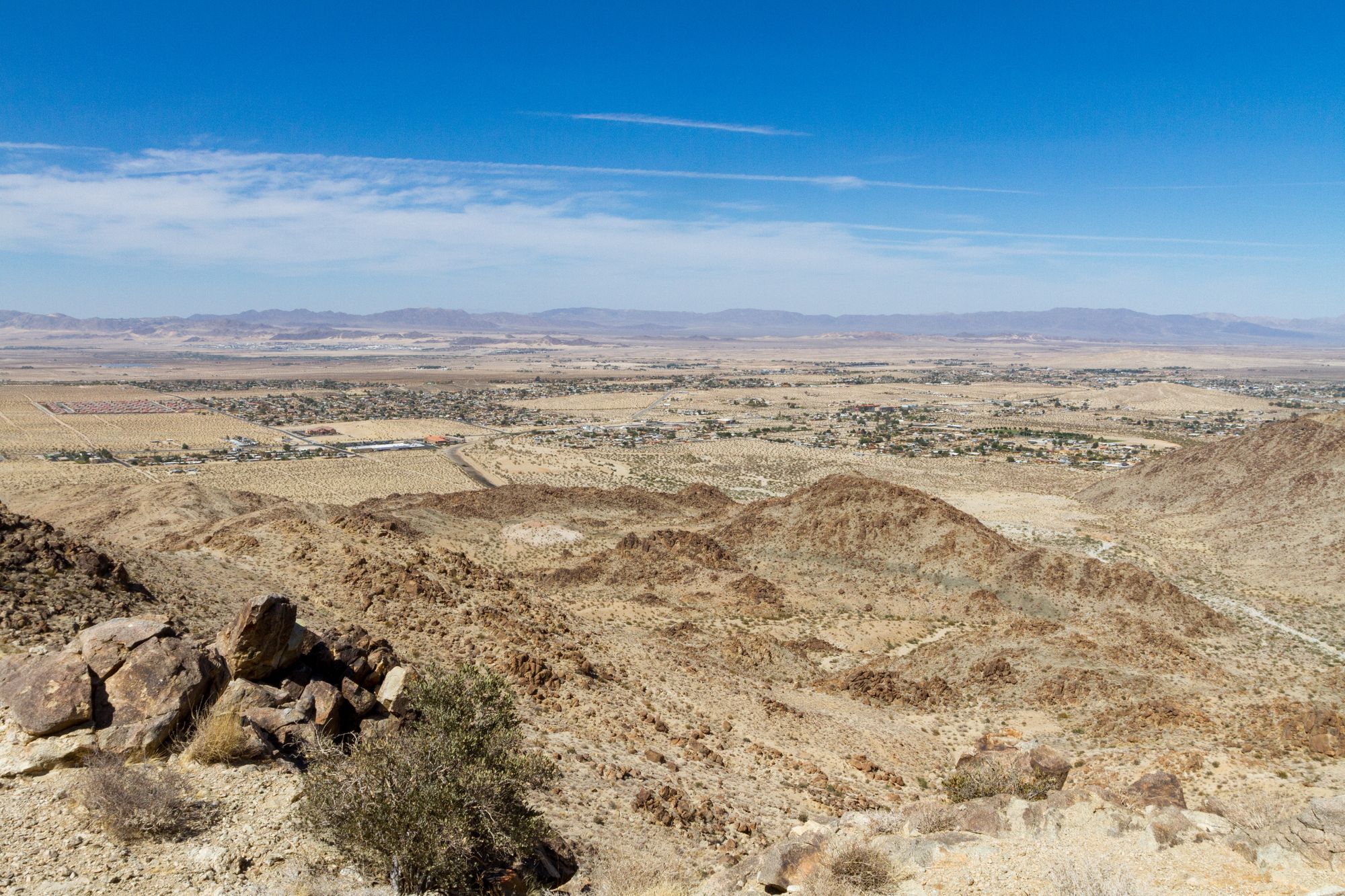 The trail climbs steeply up the rocky hillside from the parking lot kiosk. You'll find some rock-carved steps as the trail keeps a steady grade to the high point. At a switchback a half mile up is a sweeping view of the town of Twentynine Palms and the Marine base beyond. While you are catching your breath, you might wonder why a town called Twentynine Palms has an oasis called Fortynine Palms. The Oasis of Mara at the Visitor Center once had 29 palms, which the town was named after.