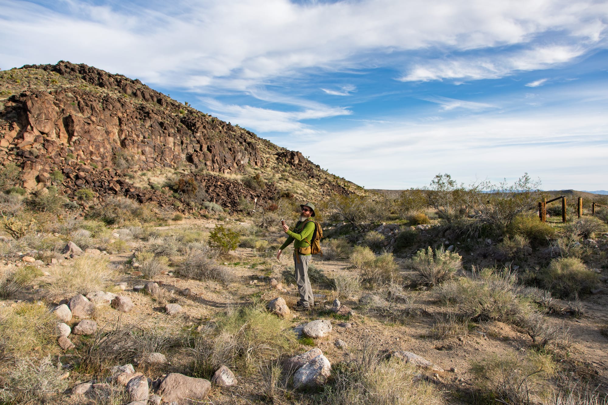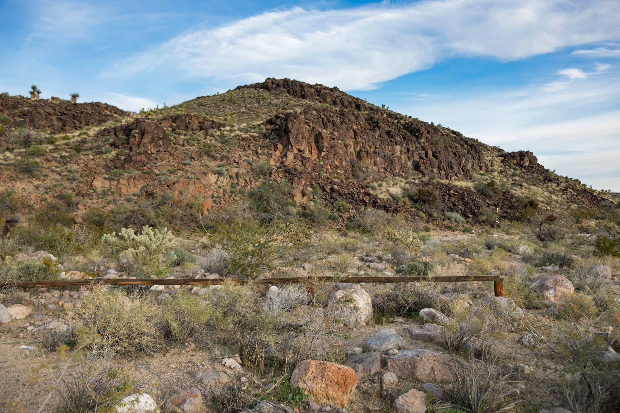 Petroglyphs often cluster throughout the East Mojave wherever water meets easy travel routes. A BLM study found that nearly every known rock art site in the region was associated with springs, natural tanks, or seasonal water sources. Grass Canyon fits this pattern. The mesquite trees here indicate water lingers at shallow depth, and the butte stands out along the hills - a natural place to mark territory along the wash.
