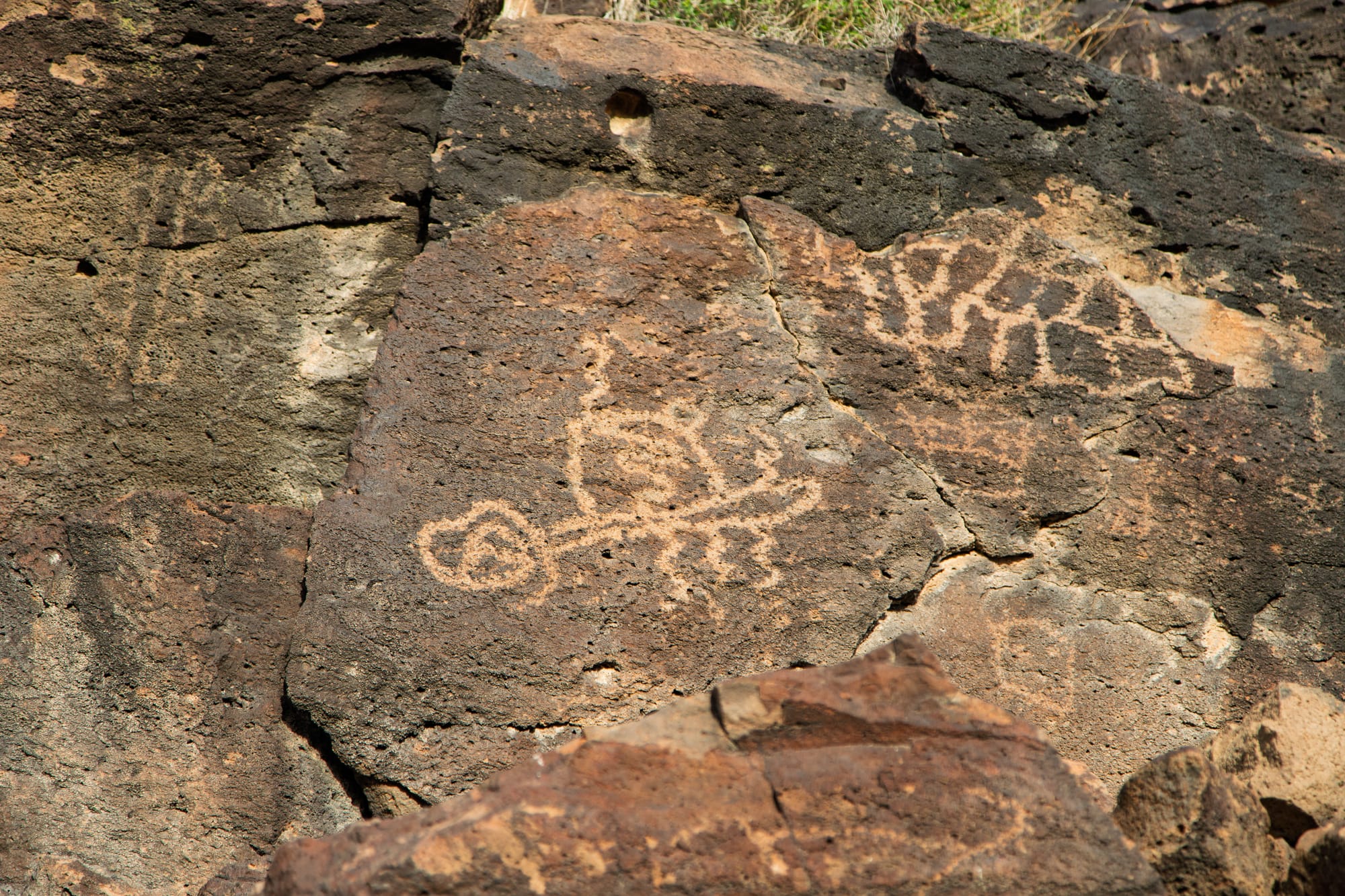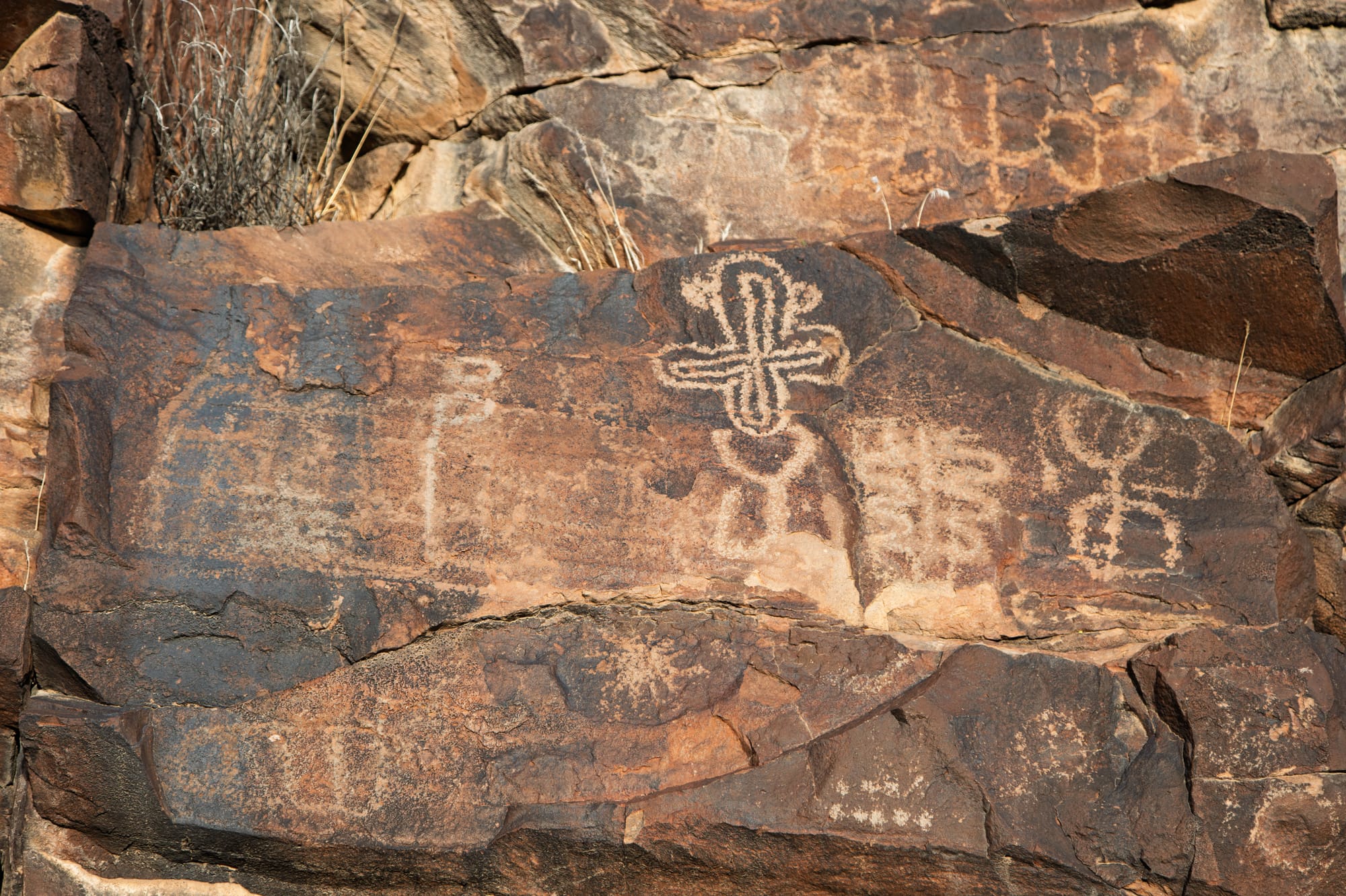 Native Americans passed through Grass Canyon thousands of years ago and left their marks on the basalt. I am not sure why they picked these rocks, though. There are plenty of other surfaces around that don't have anything on them. But this spot where a basalt butte meets the wash is covered with petroglyphs, probably over 70 of them pecked into the west-facing cliff and scattered across the boulders at its base.