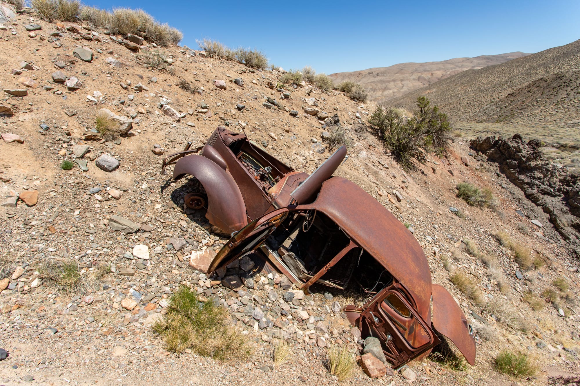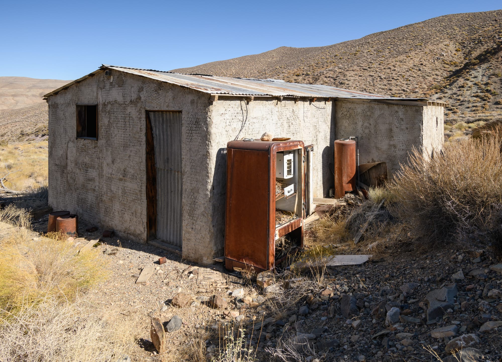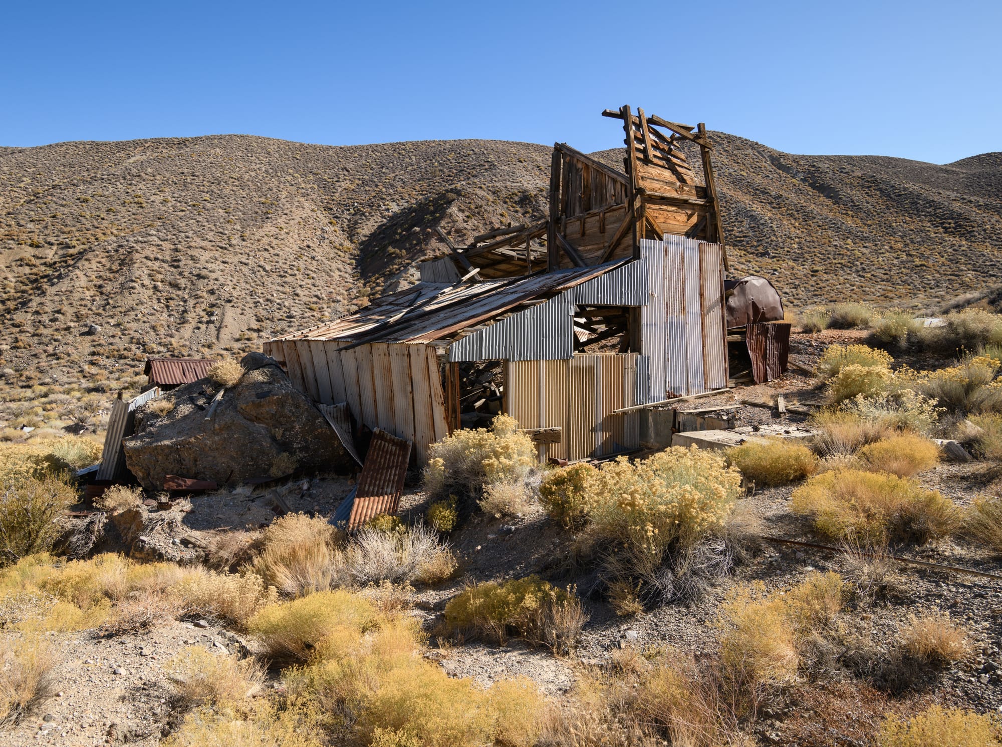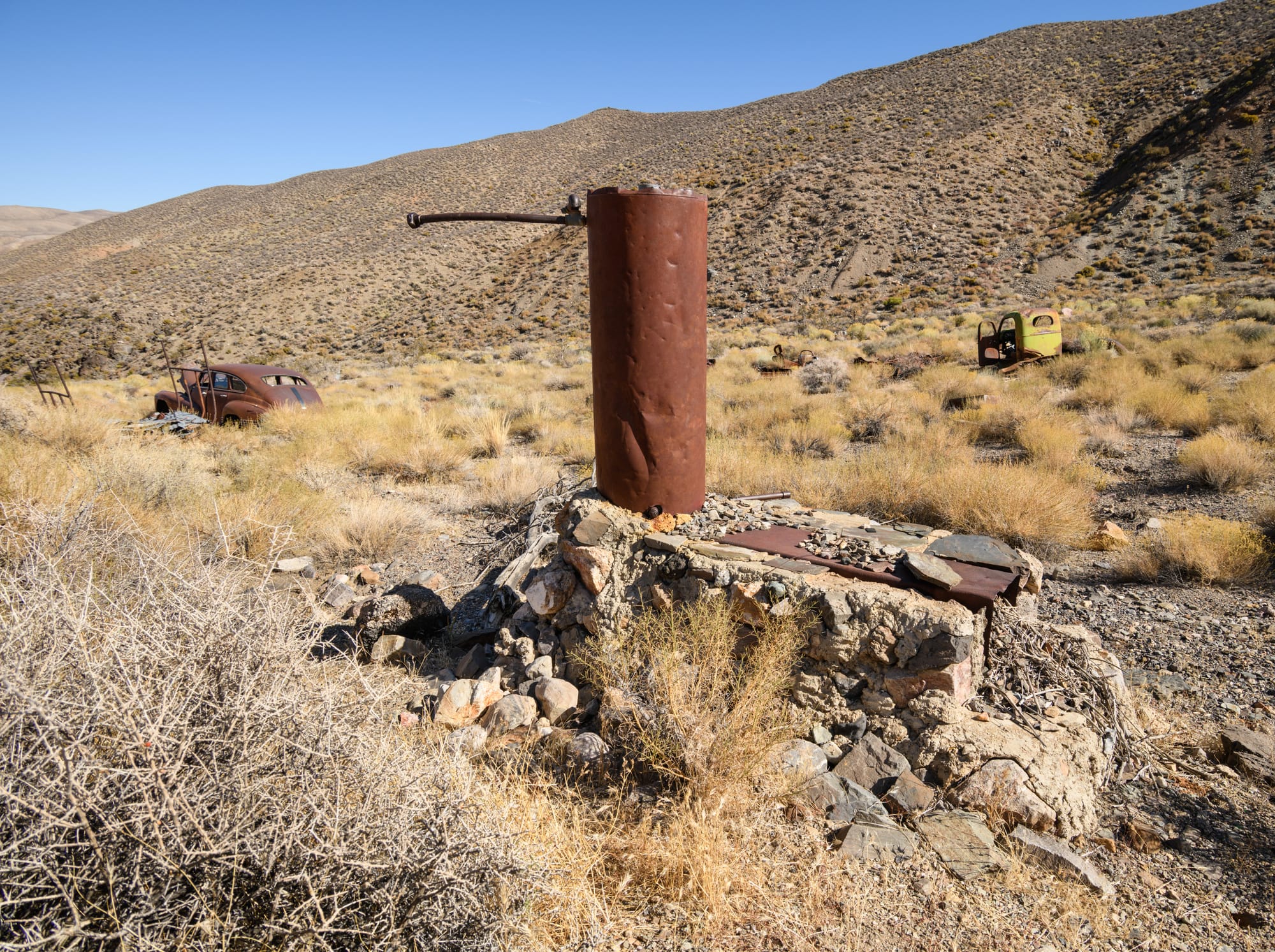 Tucked away in a small canyon just off of Emigrant Canyon/Wildrose Road, on the slopes of the northern Panamint Mountains at 5,020 feet elevation, sits the Greene-Denner-Drake Mill. Forever in the shadow of its more famous neighbor, Skidoo, this quiet spot sees few visitors. This little camp contains a cabin, remains of a mill, a few old cars, and a wood-fired water heater scattered in the sagebrush.