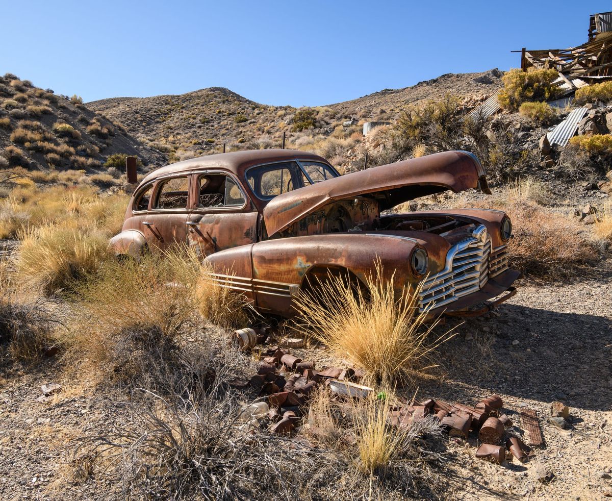 Tucked away in a small canyon just off of Emigrant Canyon/Wildrose Road, on the slopes of the northern Panamint Mountains at 5,020 feet elevation, sits the Greene-Denner-Drake Mill. Forever in the shadow of its more famous neighbor, Skidoo, this quiet spot sees few visitors. This little camp contains a cabin, remains of a mill, a few old cars, and a wood-fired water heater scattered in the sagebrush.