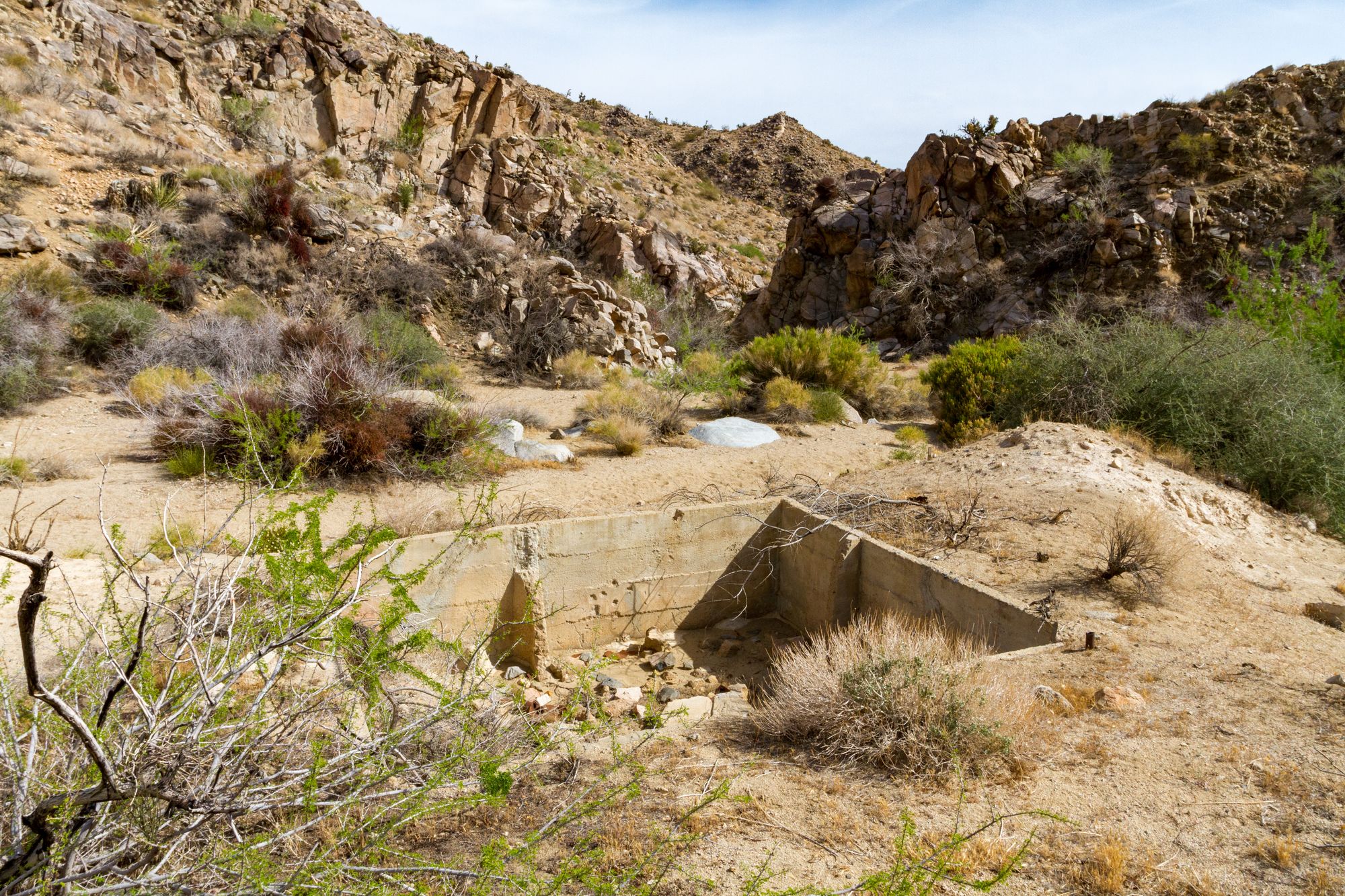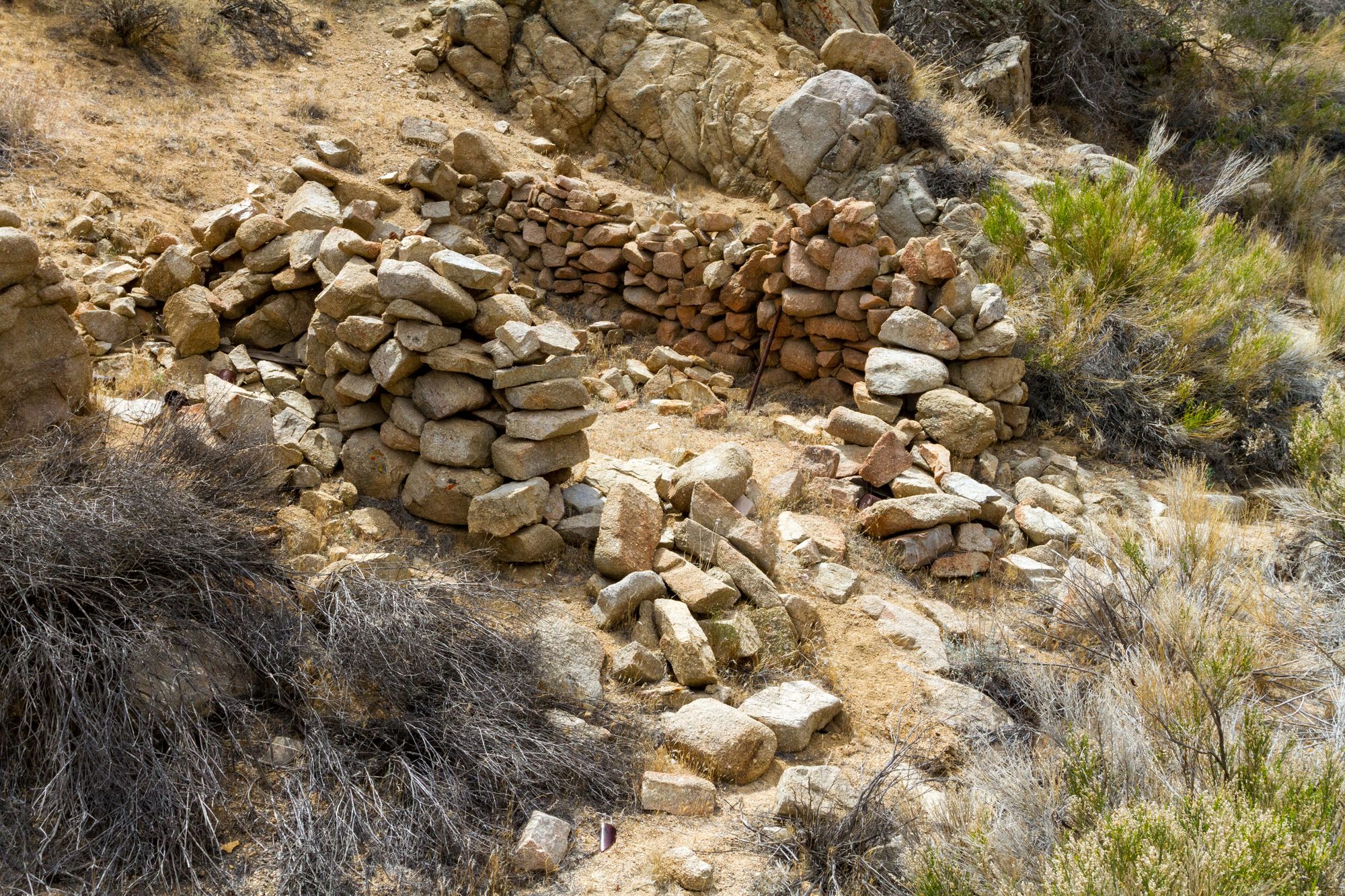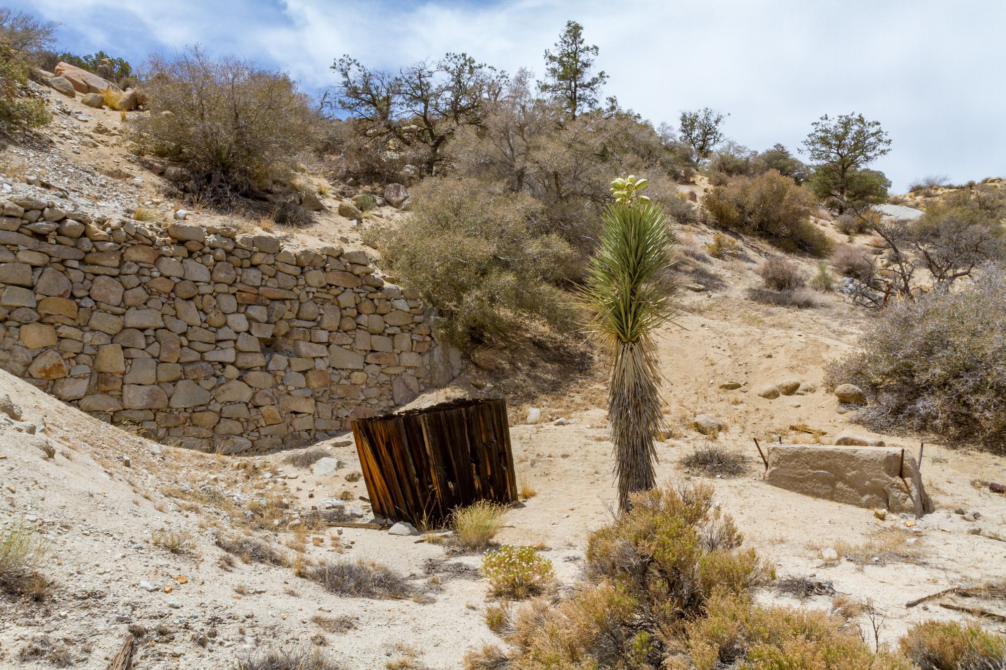 Also known as the Hansen or Henson Mine, Holland and Tingman probably owned this gold mine and worked it at the same time as the Pinyon Mine, but little is known about it. The masonry wall and foundations suggest a mill was here or at least planned for the future. Whether a mill was ever built remains a mystery. It is more likely Holland and Tingman relocated a mill to Pinyon Well for a better water supply.