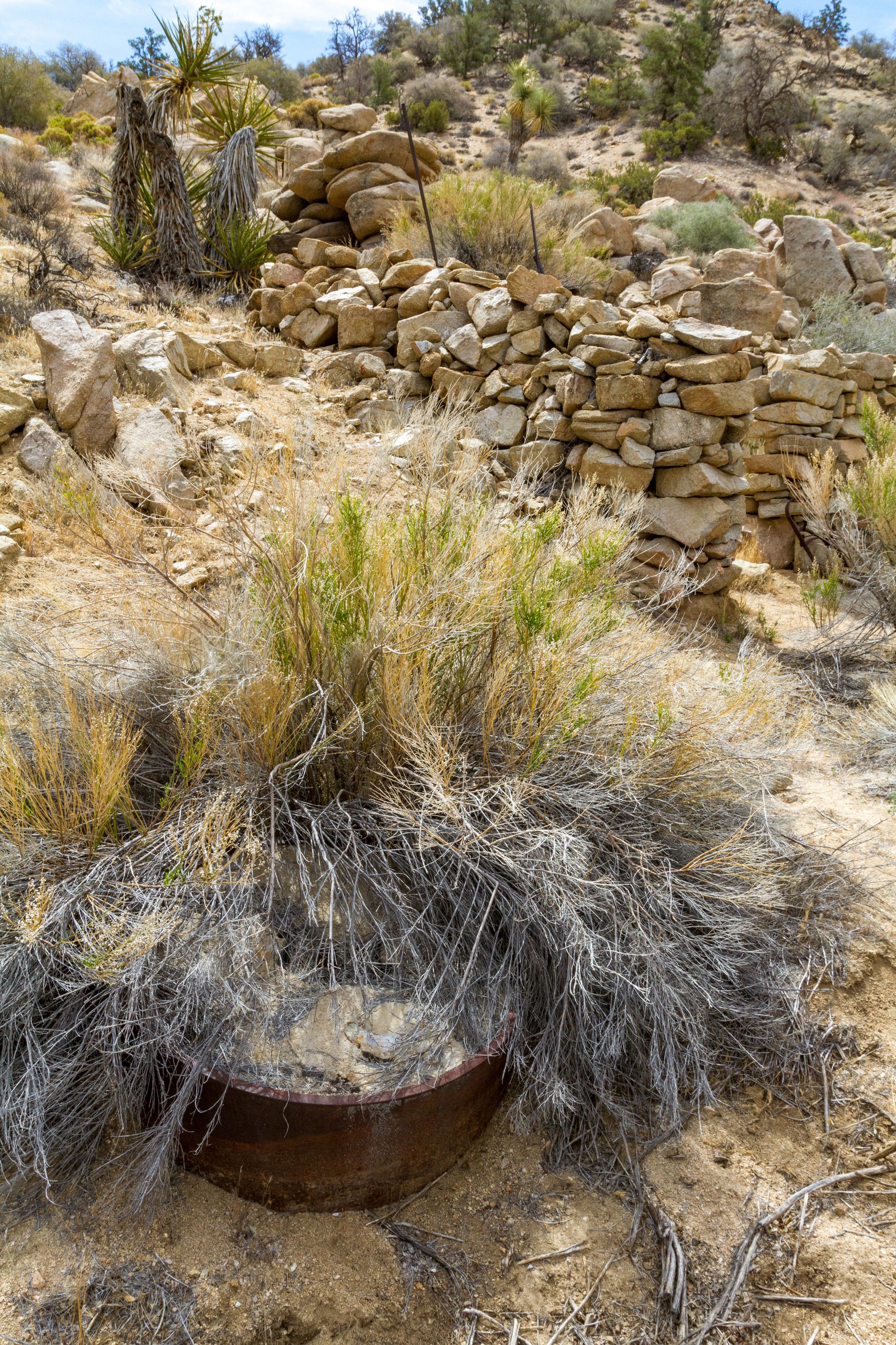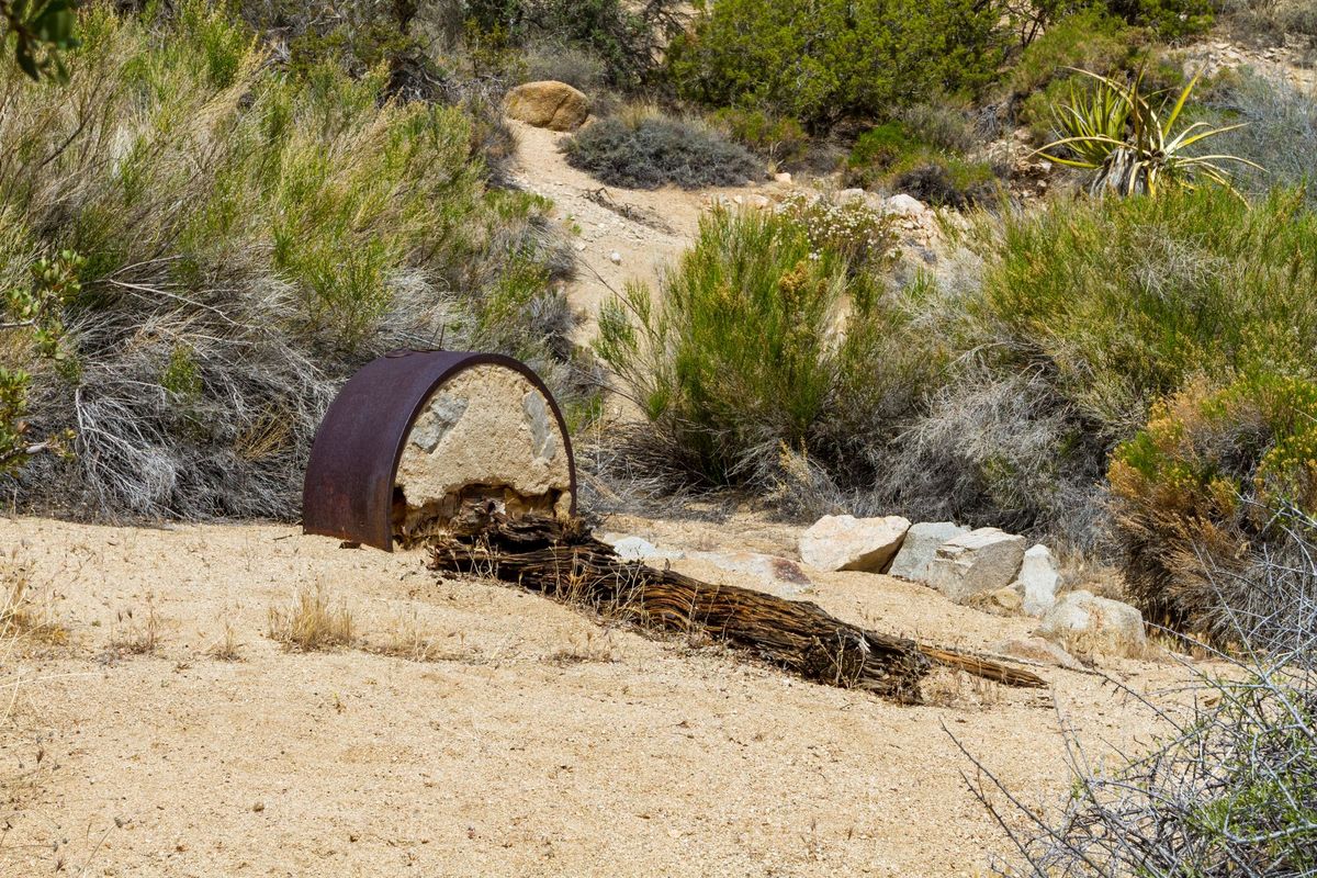 Higher up the mountain is the site of the Hensen Well and Mill. I couldn't find the well in the brush, but I did find the remains of the Chilean mill. A Chilean mill is a type of arrastra with two vertical grinding wheels for crushing rock. In this case, the wheels are made from concrete and banded in iron.