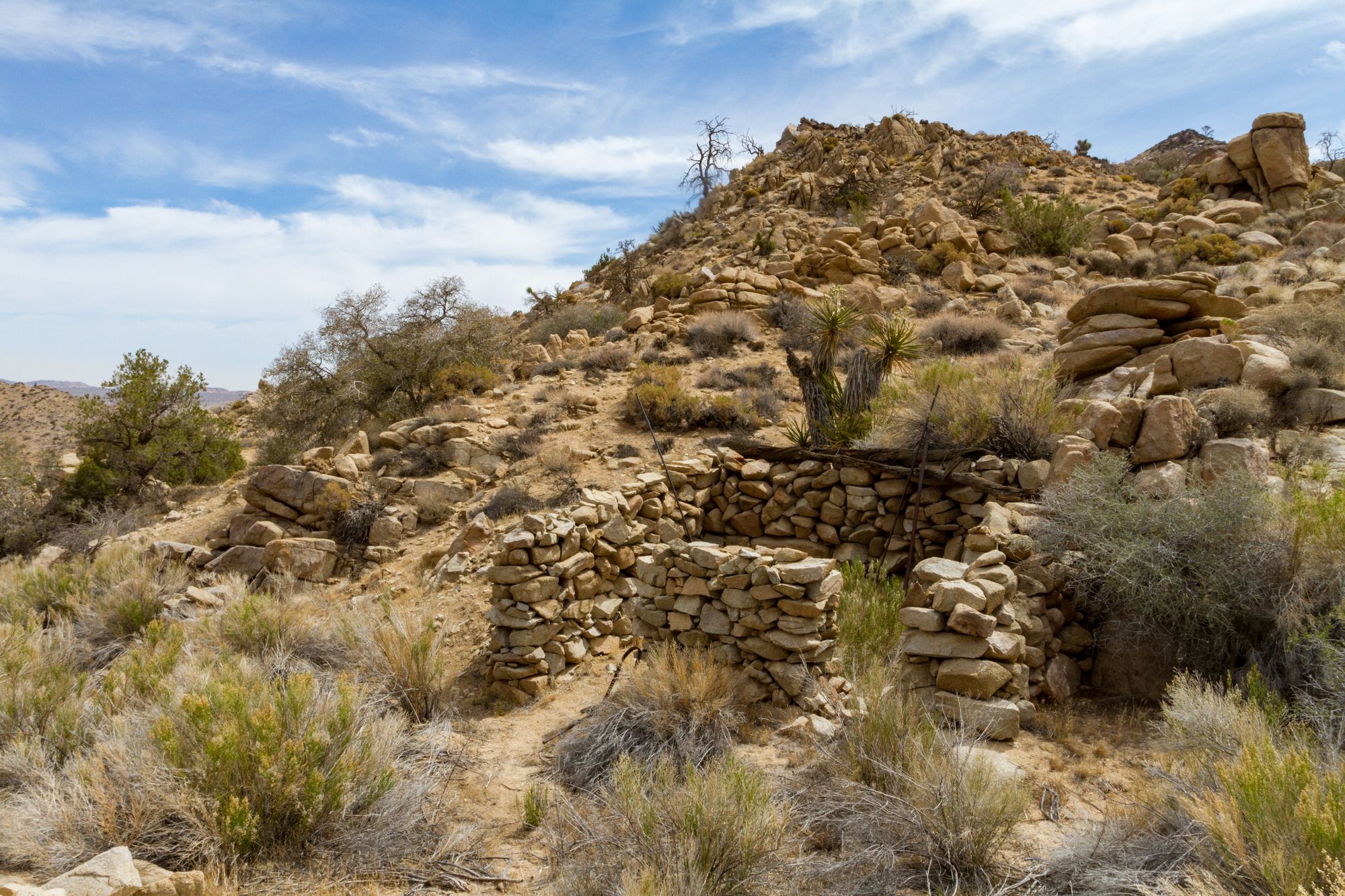This hike is an adventurous cross-country ramble exploring a few historic mining ruins in the seldom-visited Pinyon Mesa country at the end of Geology Tour Road in Joshua Tree. Few people venture out here, which is a shame as it is a neat area.