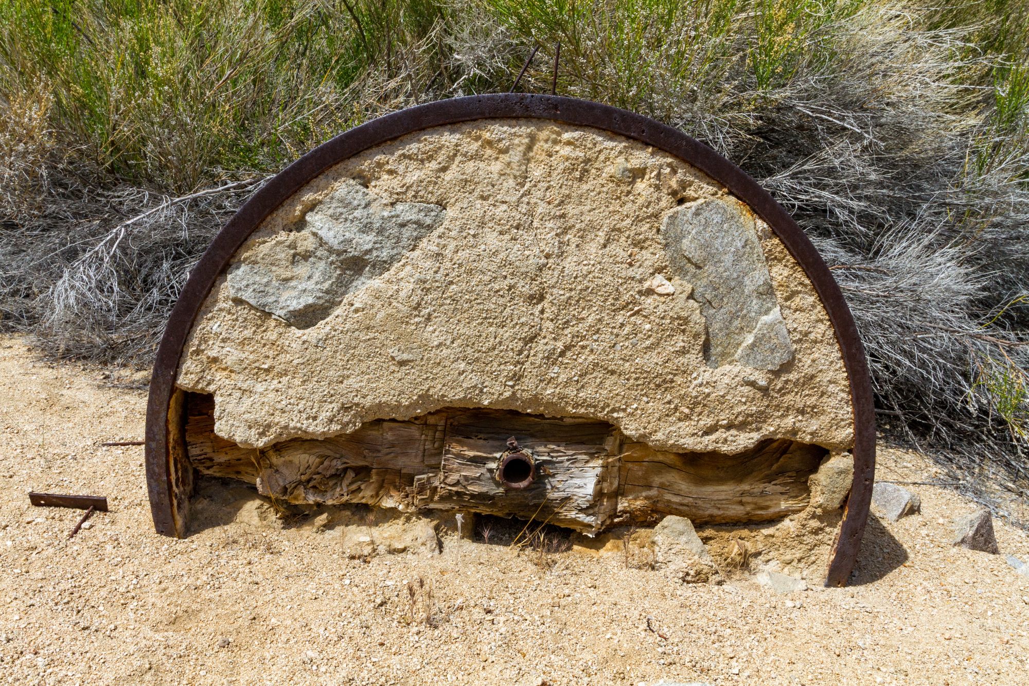The mill likely did custom runs for surrounding mines. Floods and time have scattered the wheels. One is hidden in the brush, and another is buried in the sand. Look around to find them.