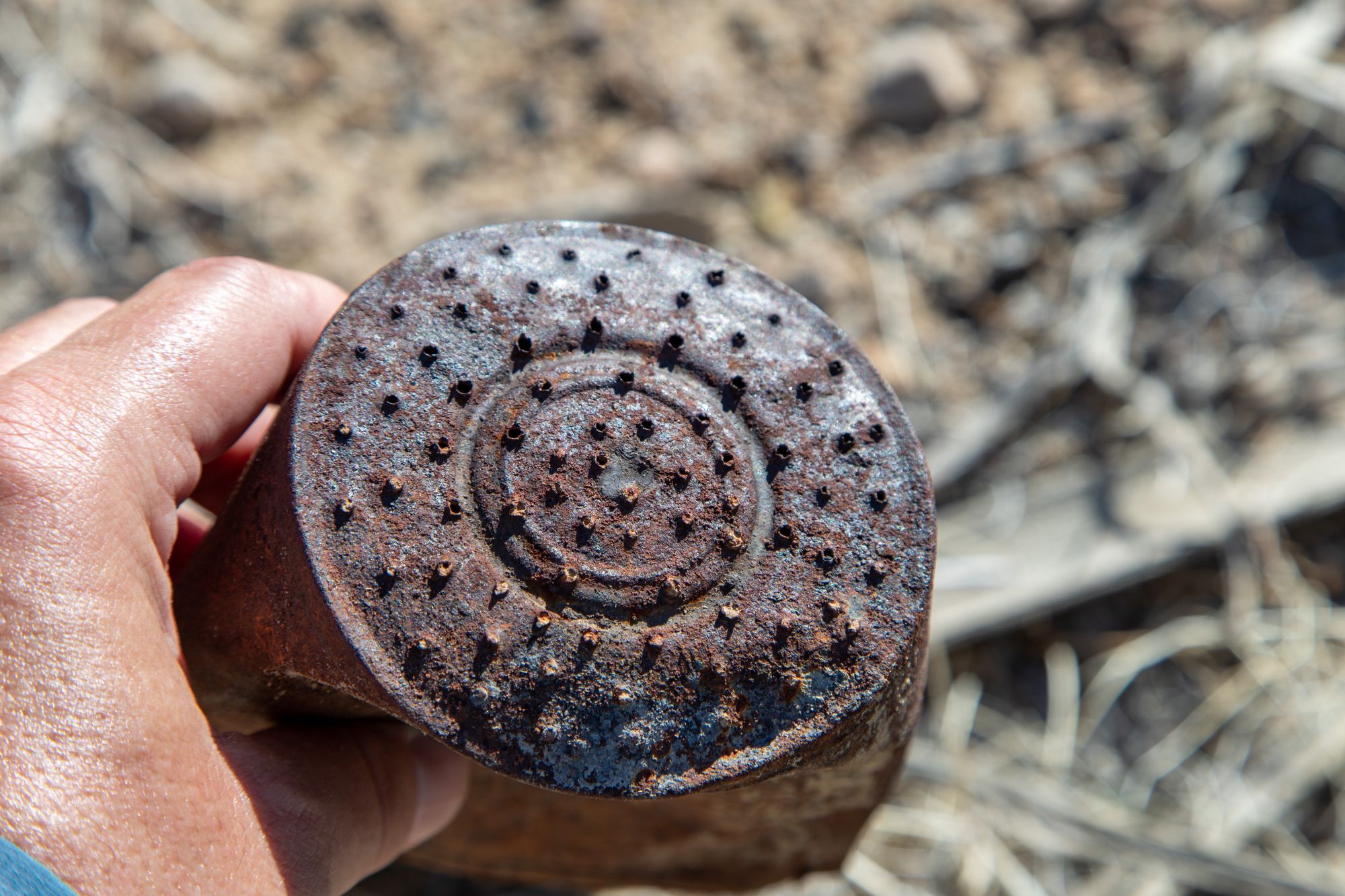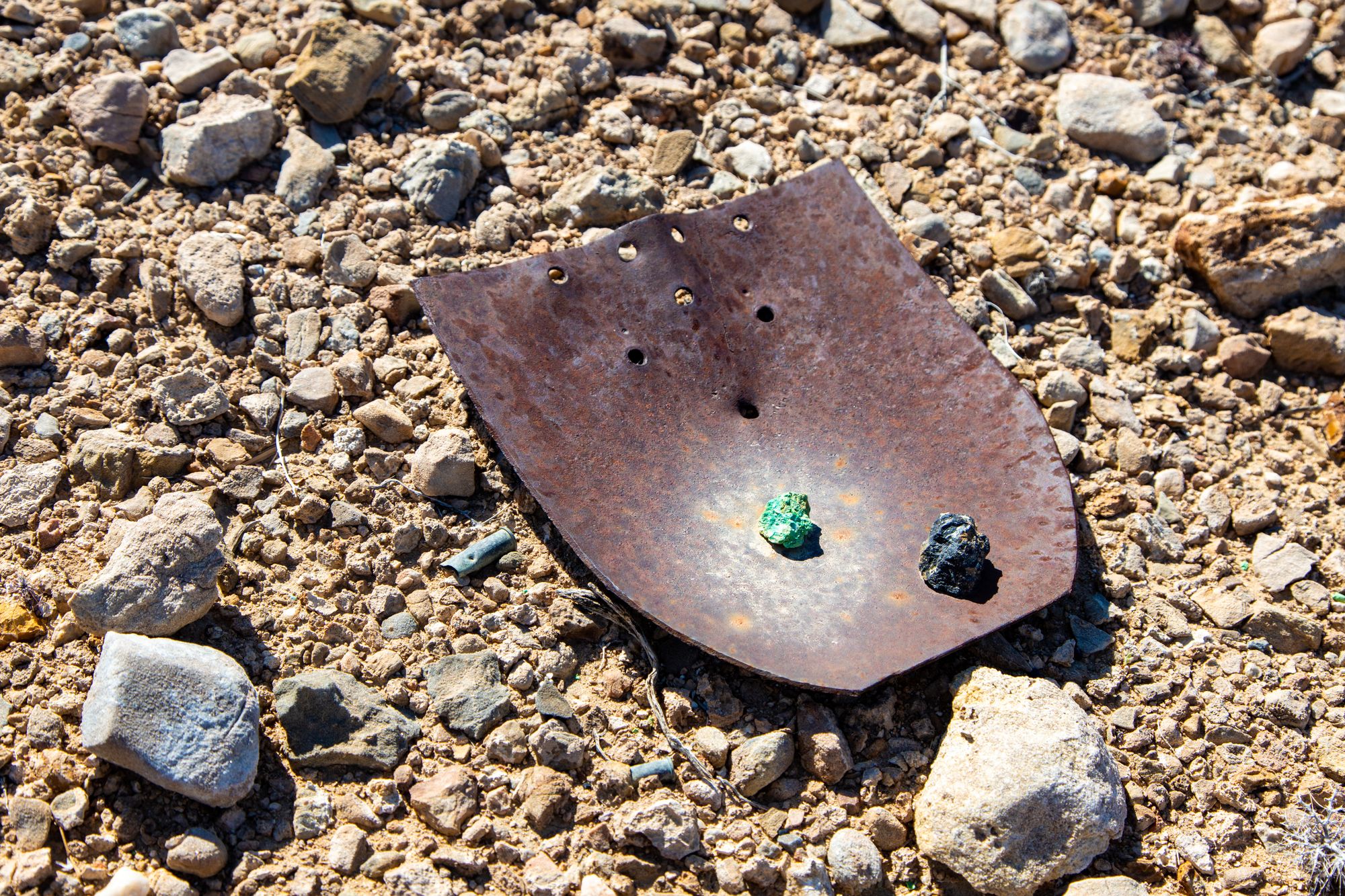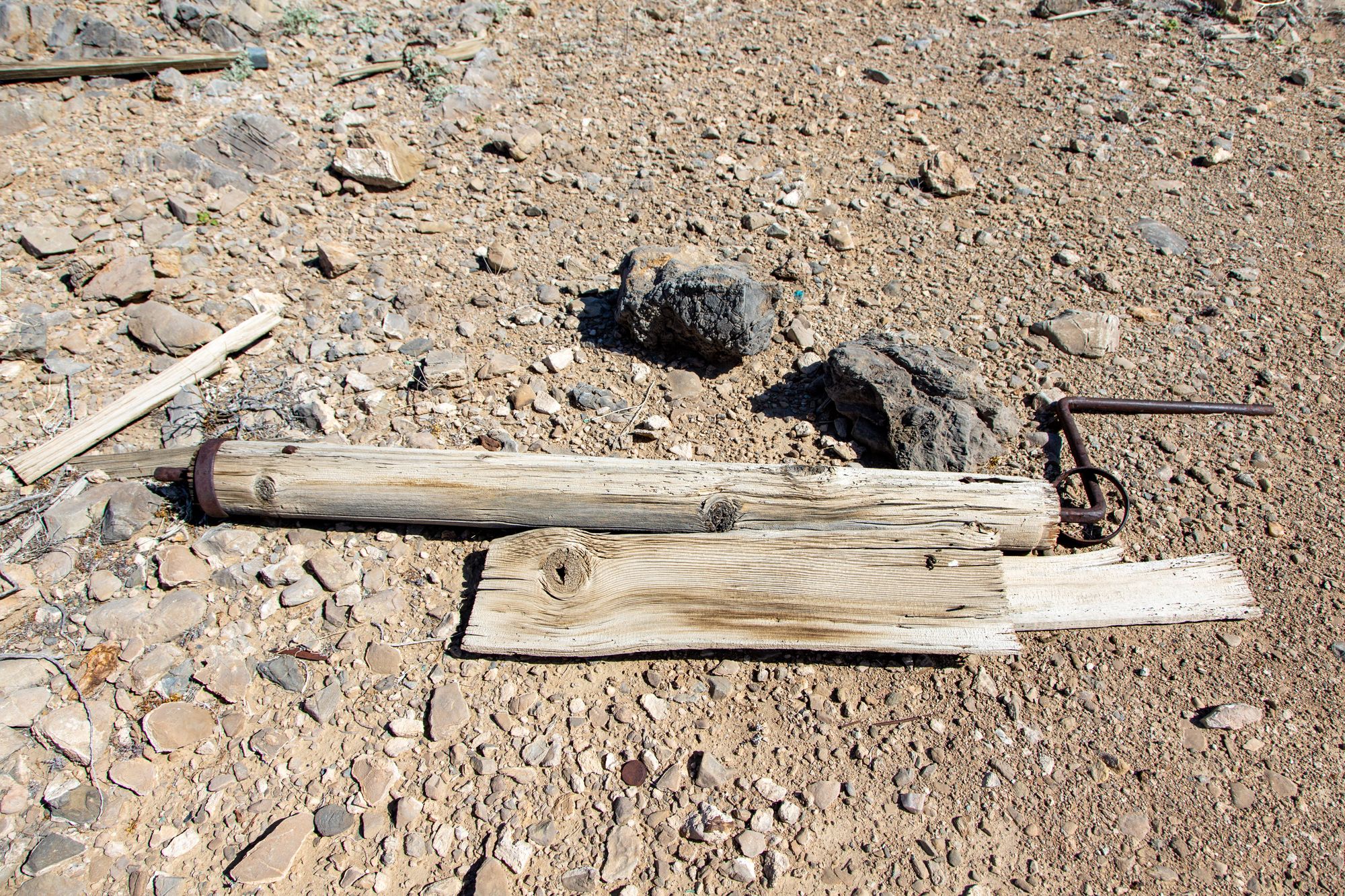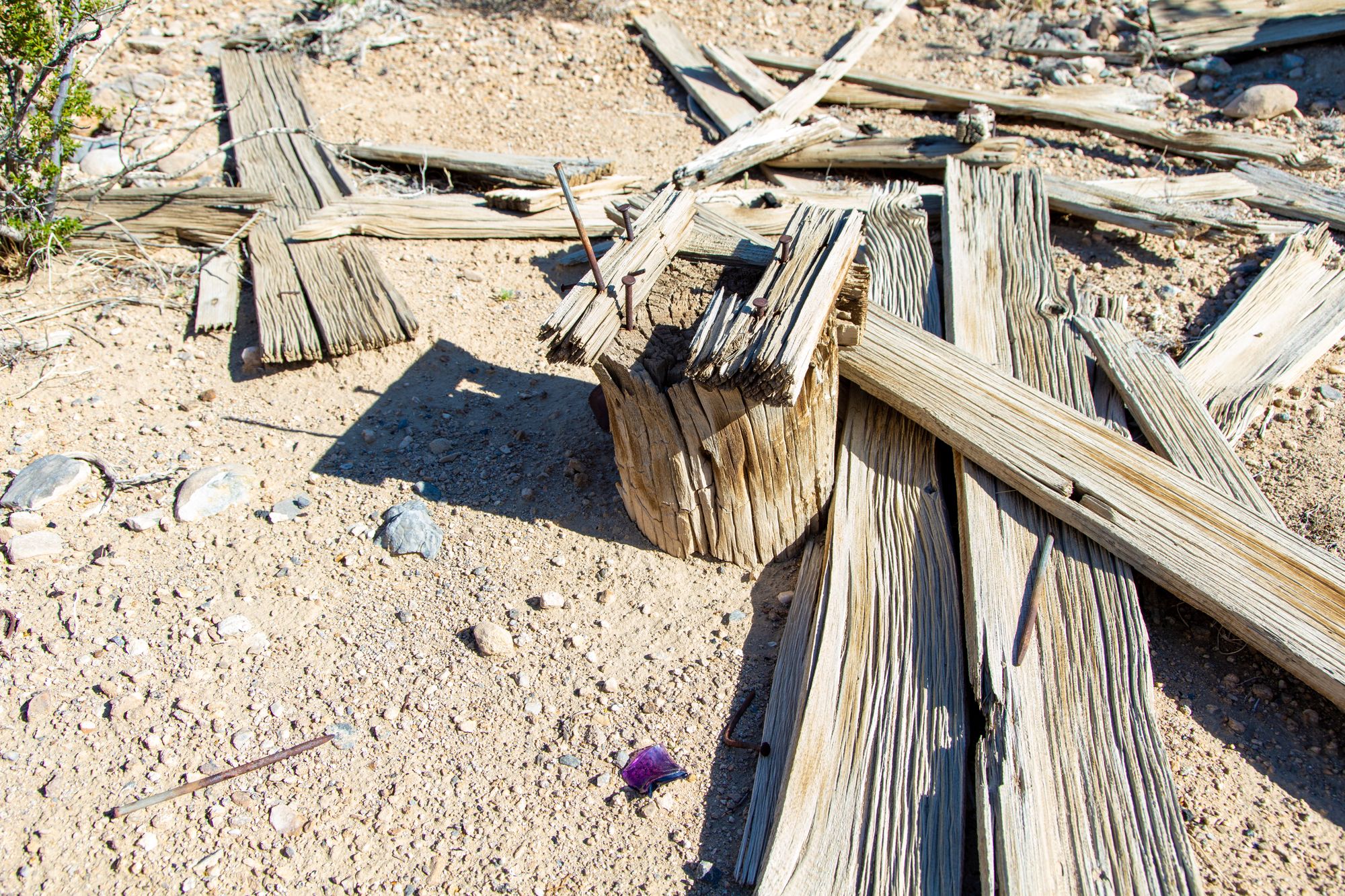 A few remnants of the old mining camp still exist. Five tent cabin sites, each with its own share of wooden debris and cans, are scattered about the area. I found a bit of canvas from one of the tent cabins, still here after all these years, under a creosote bush.