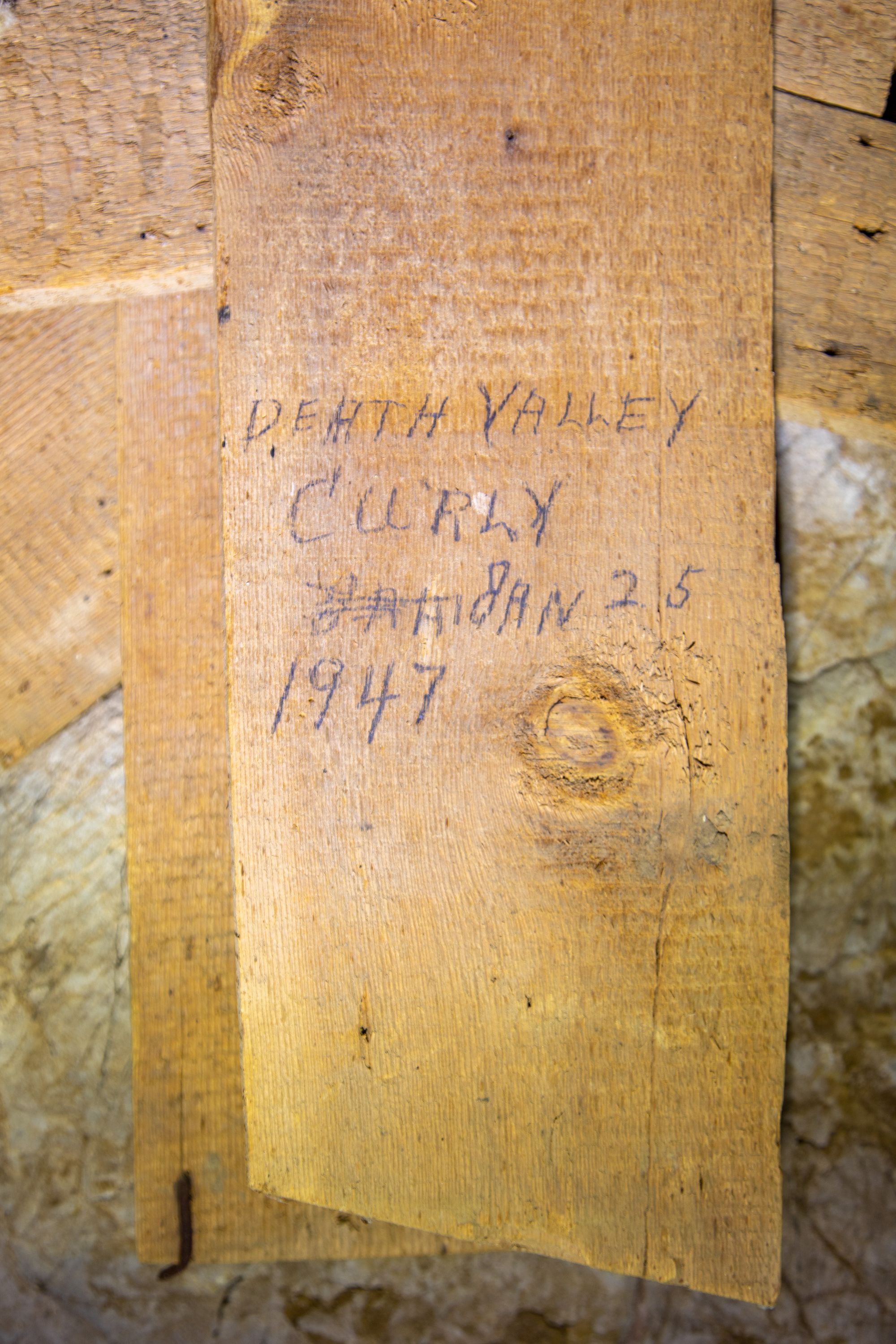 Near the camp is a small dugout with a wooden door. It was used as storage for the miners. Inside are a few old boxes. On the wall is a scratched inscription by Death Valley Curly dated Jan 25, 1947. He was a well-known prospector at the time. (Also see the Scott and O'Brien Cabin). Finding the inscription made my day. The dugout isn't on my map, but it isn't hard to find if you explore around a bit. Reaching it will be a little tricky, though.