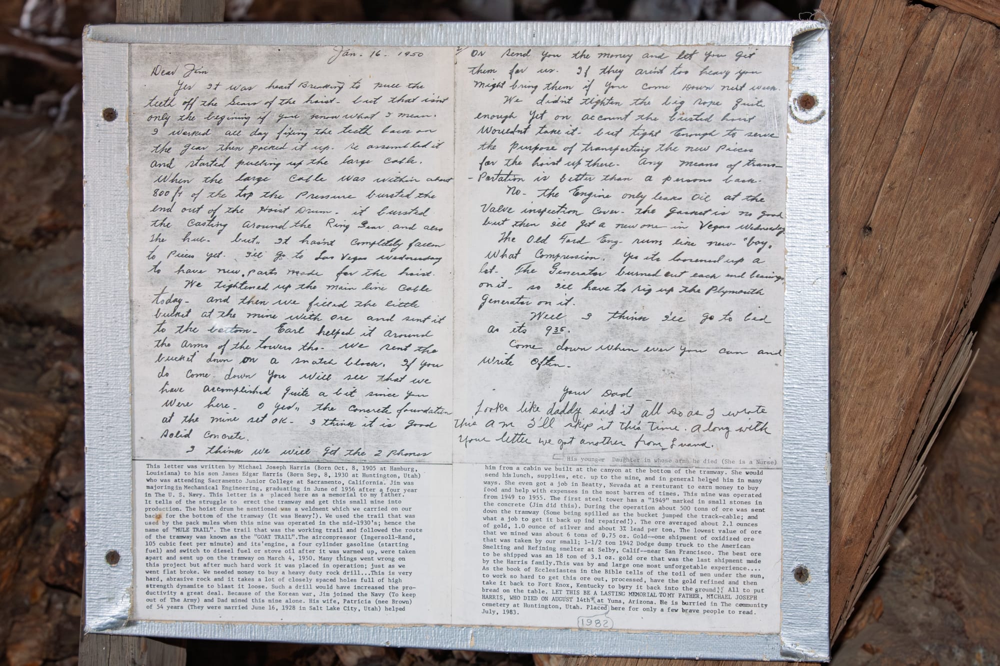 A January 16, 1950 letter from Michael Harris to his son Jim (then attending Sacramento Junior College studying mechanical engineering) reveals the constant setbacks they faced. The hoist drum had suffered a catastrophic failure, with pressure bursting the end out and breaking the casting around the ring gear. Harris had to drive to Las Vegas to have new parts fabricated.