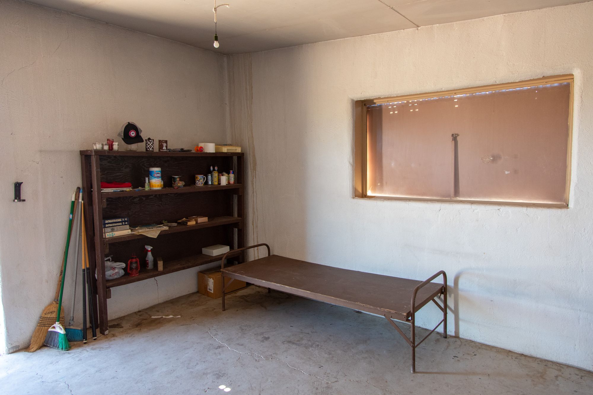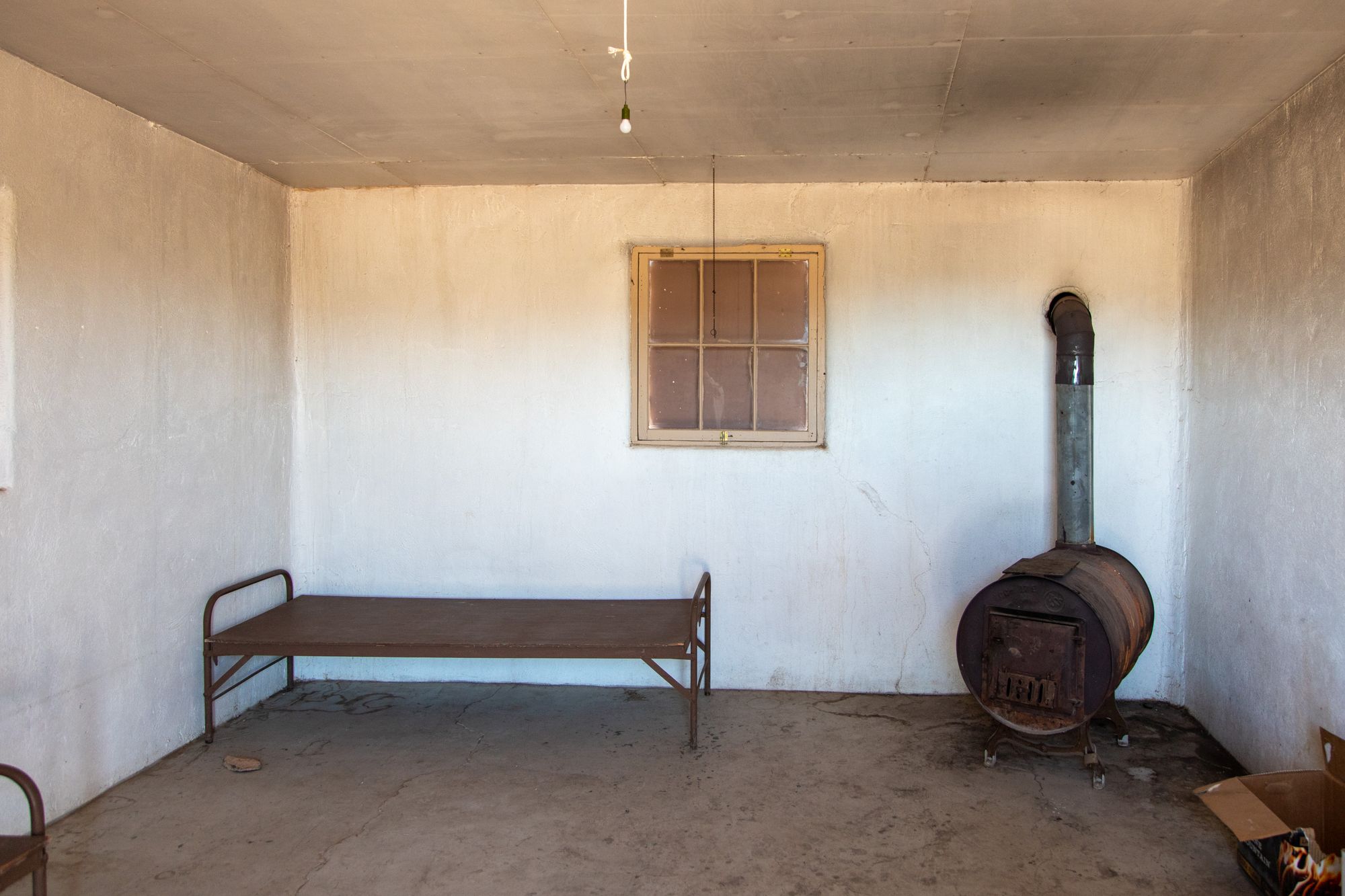 The two-room cabin is built from basalt rocks that were collected from the surrounding desert. One room is available for overnight stays on a first-come, first-served basis. It is free to stay here. The cabin is relatively empty, with only two simple beds and a stove.