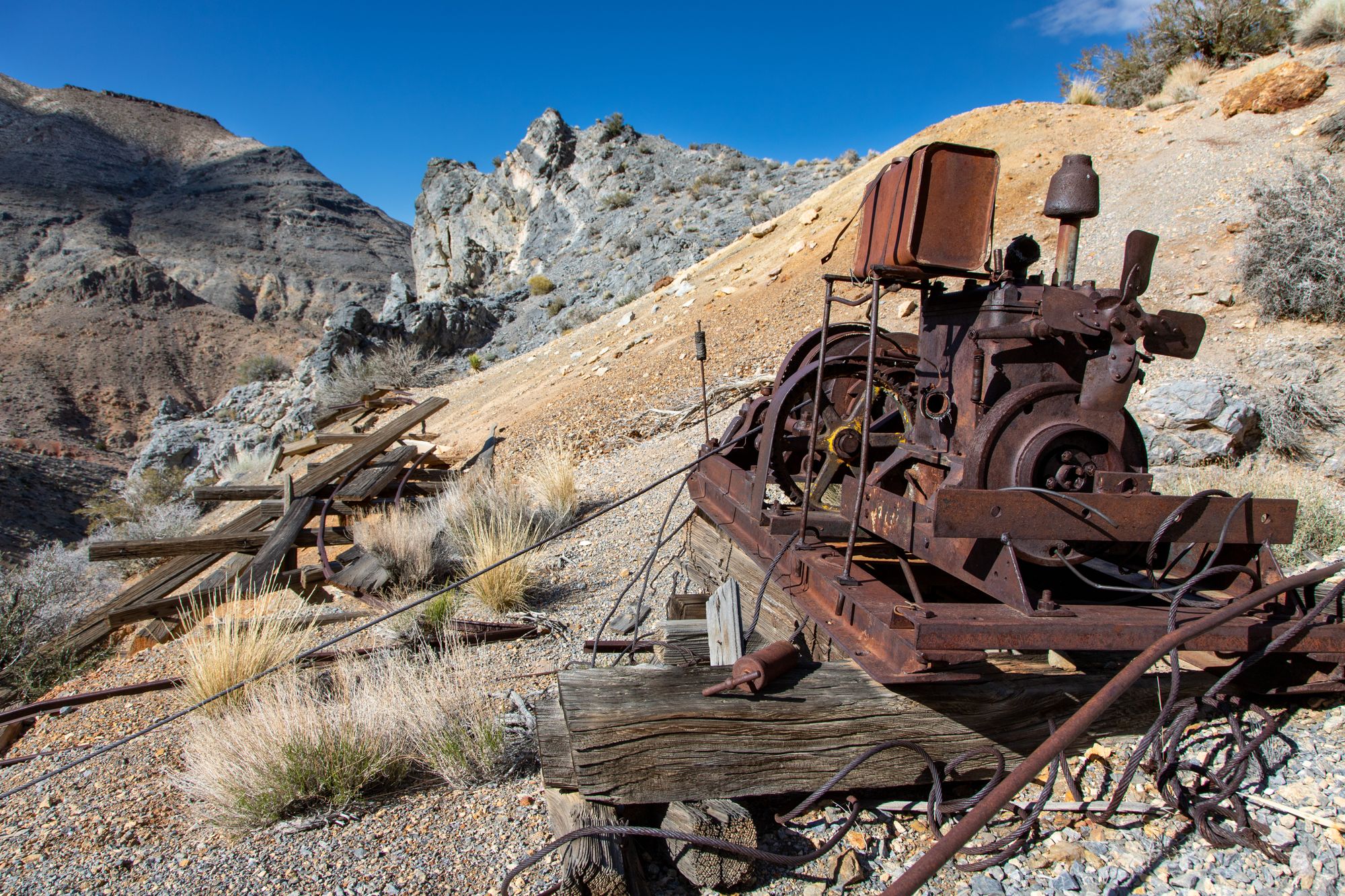 Lemoigne traveled far and wide around Death Valley country and discovered a few mines over the years, but up in the Cottonwood Mountains, he discovered a lead-silver ore body that was his favorite. He worked his mine only on a very small scale. He never developed it beyond what he needed to live off of at the time. He referred to it as his “bank.”