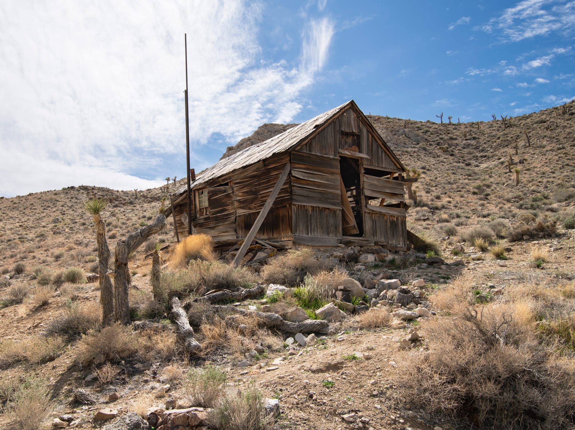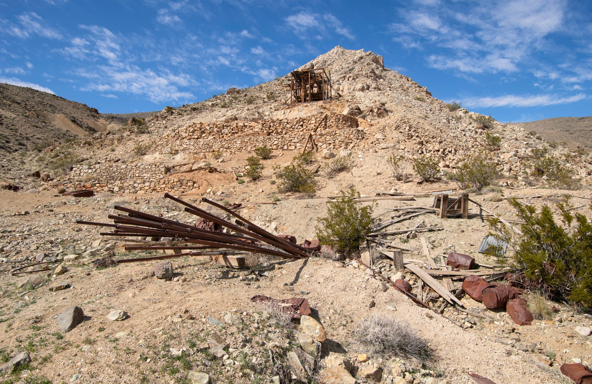 The Lost Burro is the only gold mine in the Ubehebe District, a region otherwise known for lead, copper, and silver. It sits in a narrow canyon on the range between Hidden Valley and Racetrack Valley, reached by a rough 4WD spur off the Hidden Valley road. The cabin is falling apart and only a skeleton of the stamp mill still remains above it, but the site is well worth the drive.