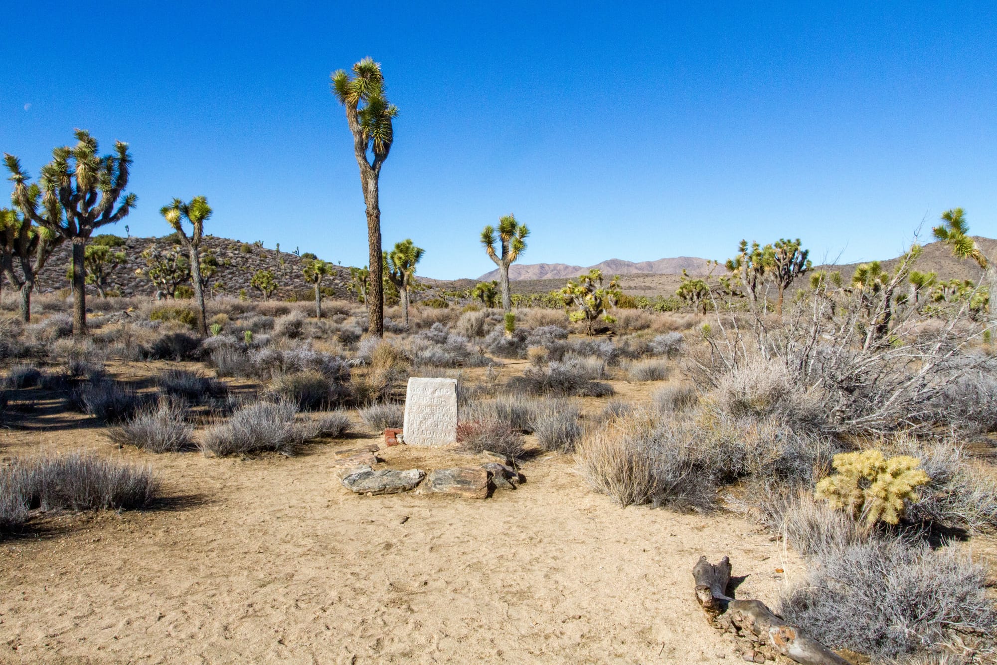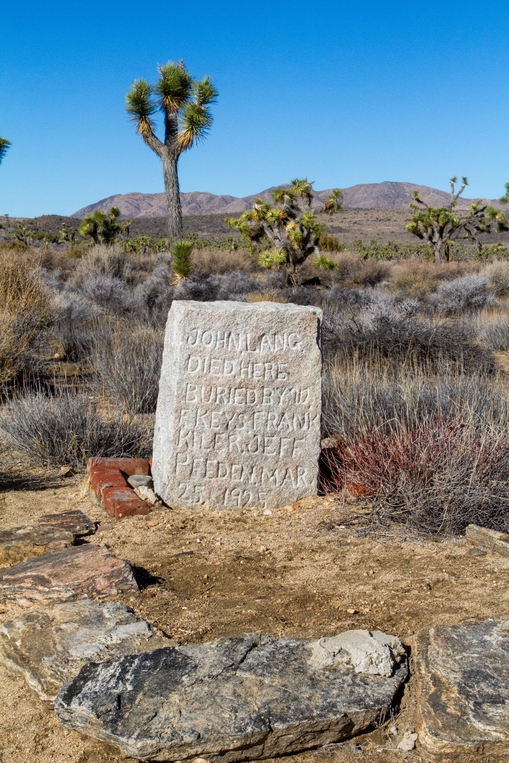 After being forced to sell out, Johnny Lang lived in a shack in Lang Canyon, occasionally prospecting in the surrounding hills. In 1925, at the age of 73, Johnny went on his final trip. After putting a sign on the door of his shack stating that he had gone to town for supplies, he started across the valley. Several months later, while grading the road to Salton View (now Keys View), Bill Keys found John's mummified body on the valley floor. His provisions numbered only a square inch of bacon and a little flour. His body was wrapped in canvas and buried on the spot. His lonely grave may be seen today along the road to Keys View.