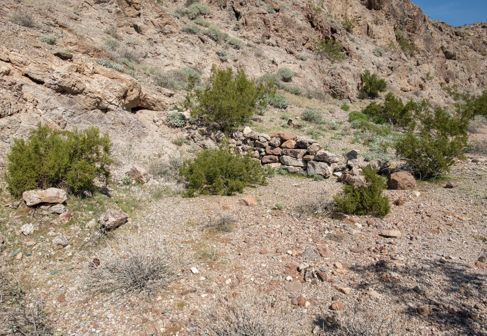 For years, I have been curious about a road depicted on old topo maps, which at one time led north from the current Hwy 178, dead-ending in a small canyon in the southern Black Mountains. A close inspection on Google Earth revealed one short remaining road segment, which climbs a steep slope near the head of the canyon. At the end of the road segment, apparent signs of excavation are visible.