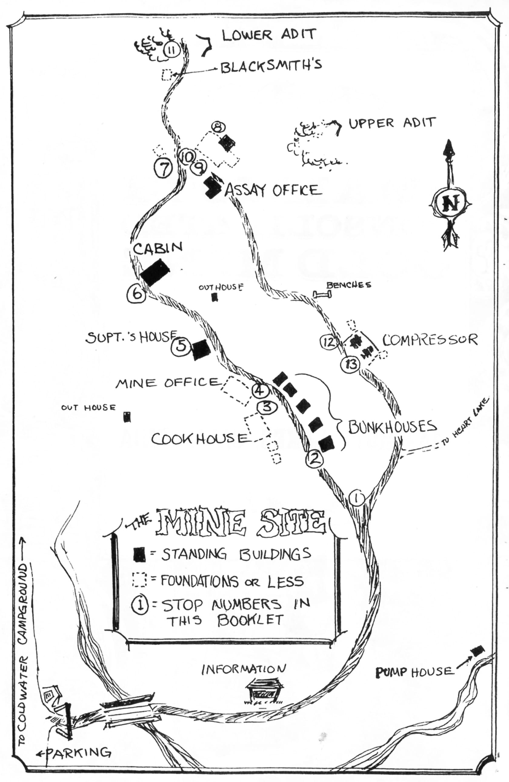 This map was included in a Forest Service brochure about the mine site, which is no longer in print. The brochure is very handy to carry along on the hike, as it also contains information about each numbered stop on the hike (the stops are no longer numbered).