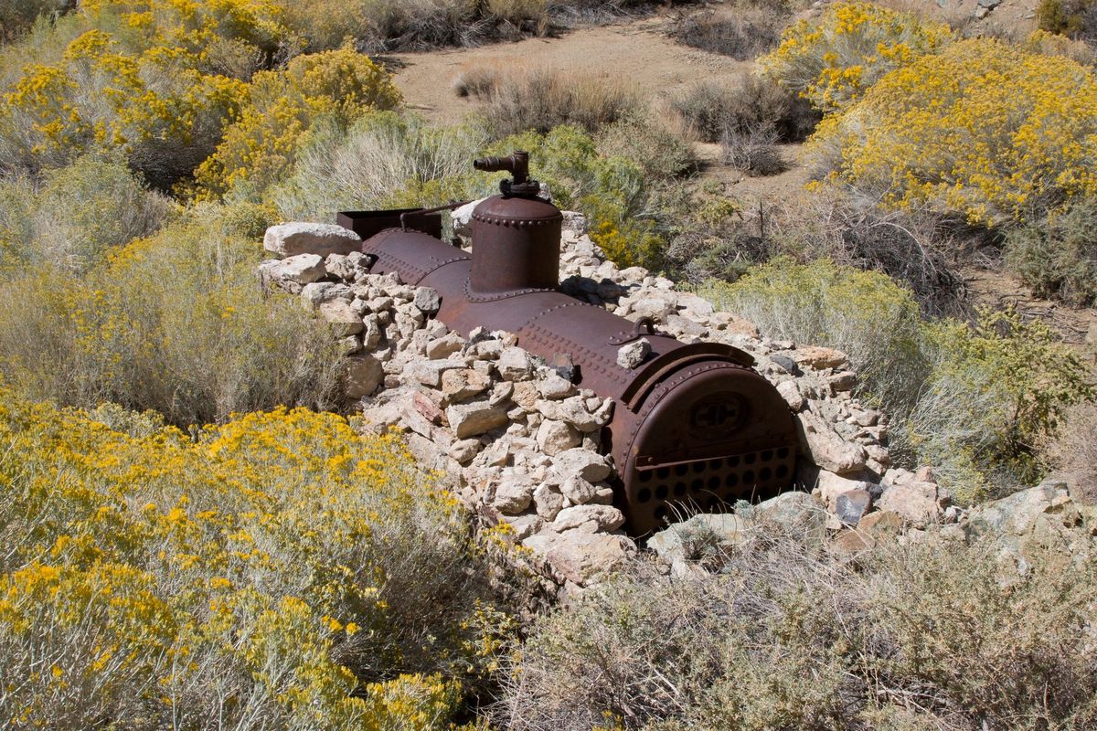 The old arrastra site and camp are a bit of a hike to reach, but it is well worth the effort. (An arrastra is a circular stone platform used to crush ore.) The camp appears to have been used mainly during the 1930s Great Depression, but the tin cans found
