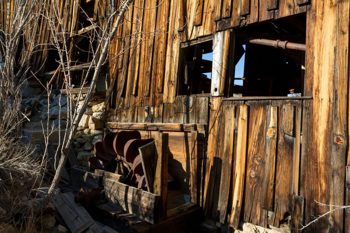 I found this hidden mill in 2013. It is unusual in that a Pelton wheel powered it. Water was funneled into a ditch and then a pipe and poured over the waterwheel, which drove the equipment inside. A water-powered mill is a rare sight in the land of little rain.