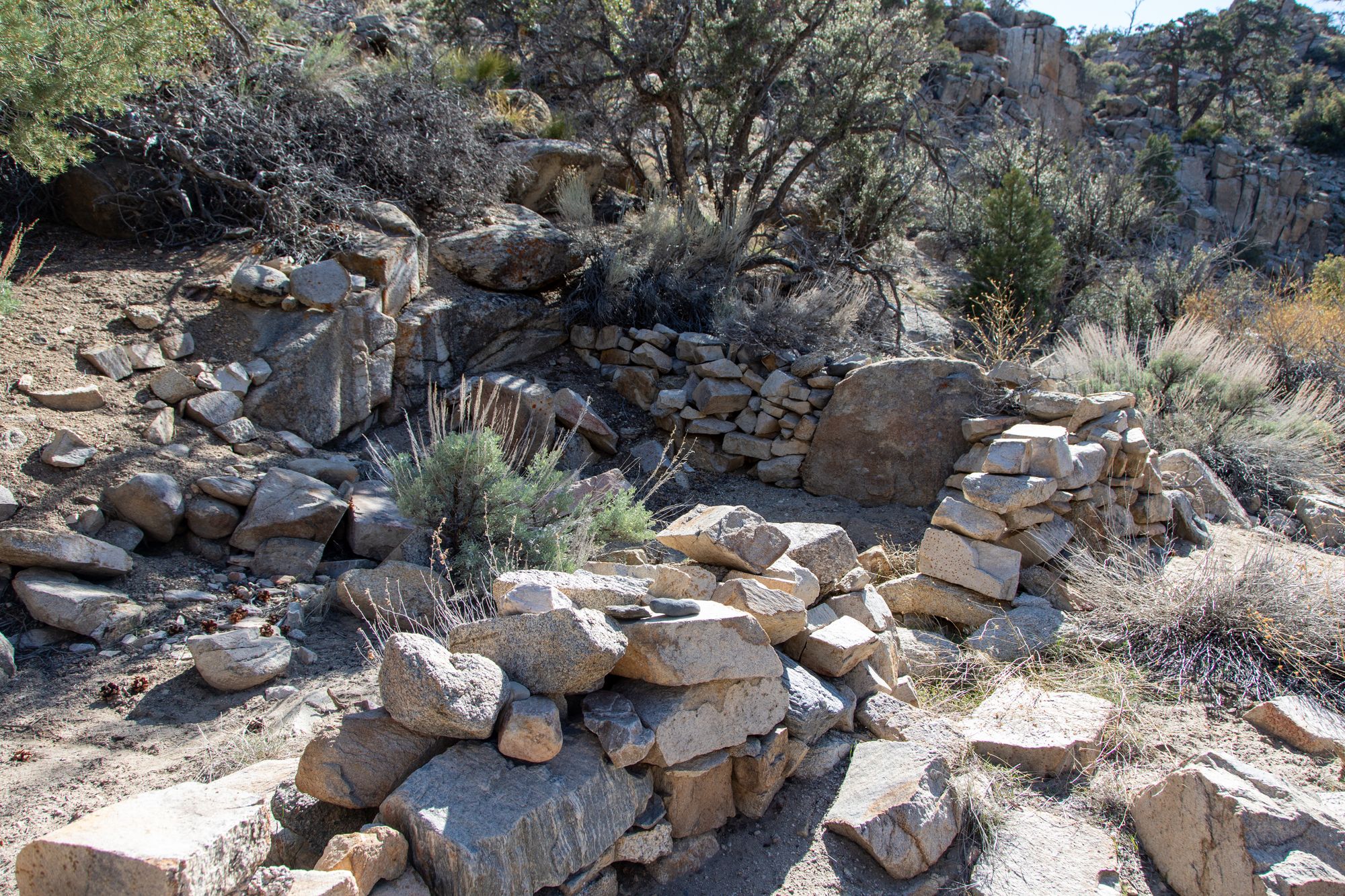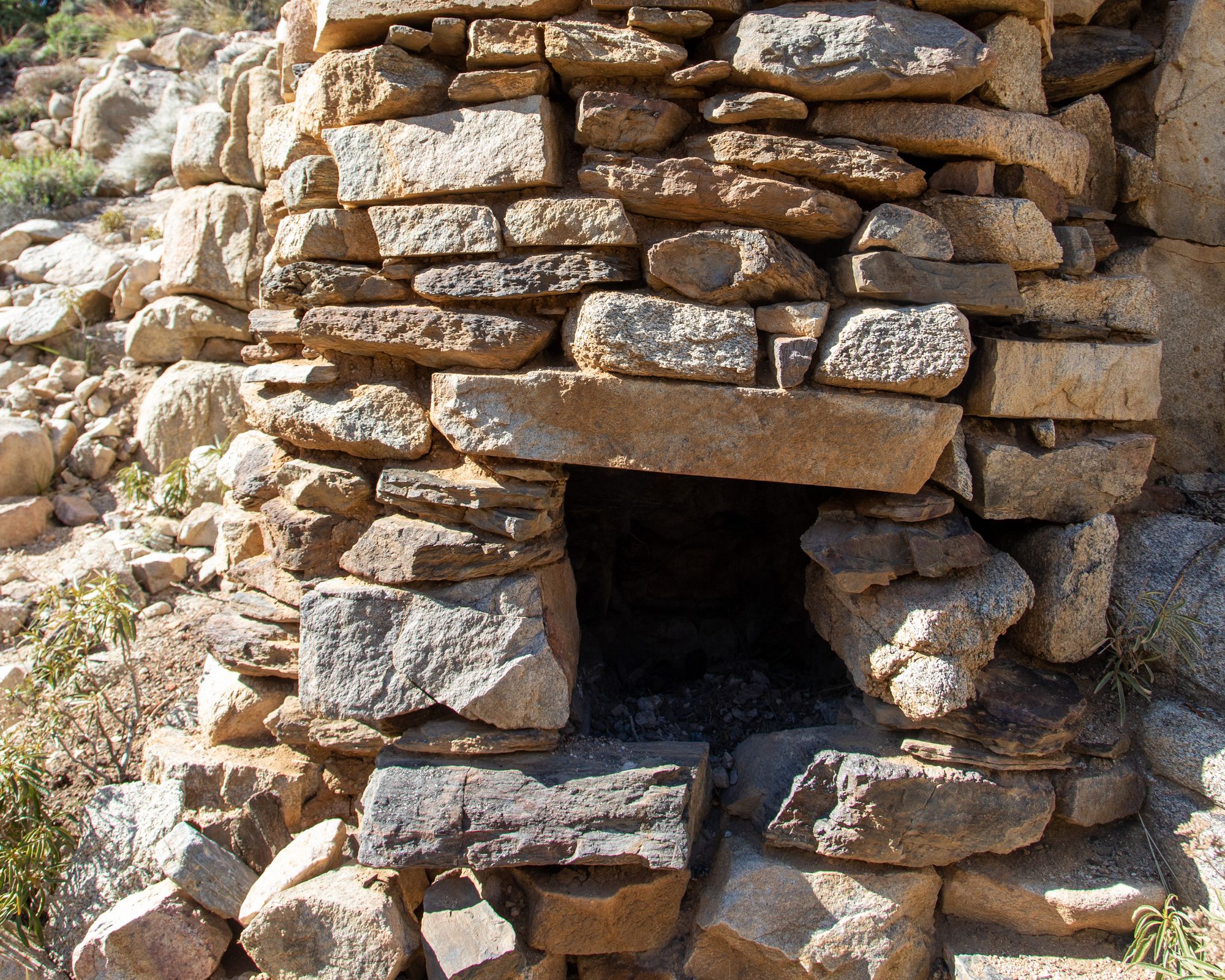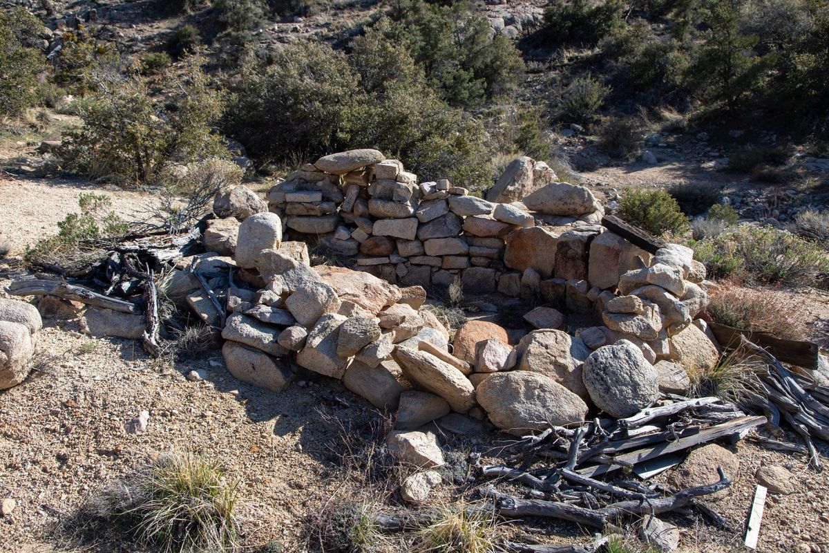 The smelter is old. One report states that it was rediscovered in 1870, so it's probably much older than that. And it is more likely of Mexican origin, not Spanish. The smelter itself is a simple affair of dry stacked rocks, and next to it are the remains of a few rock cabins.