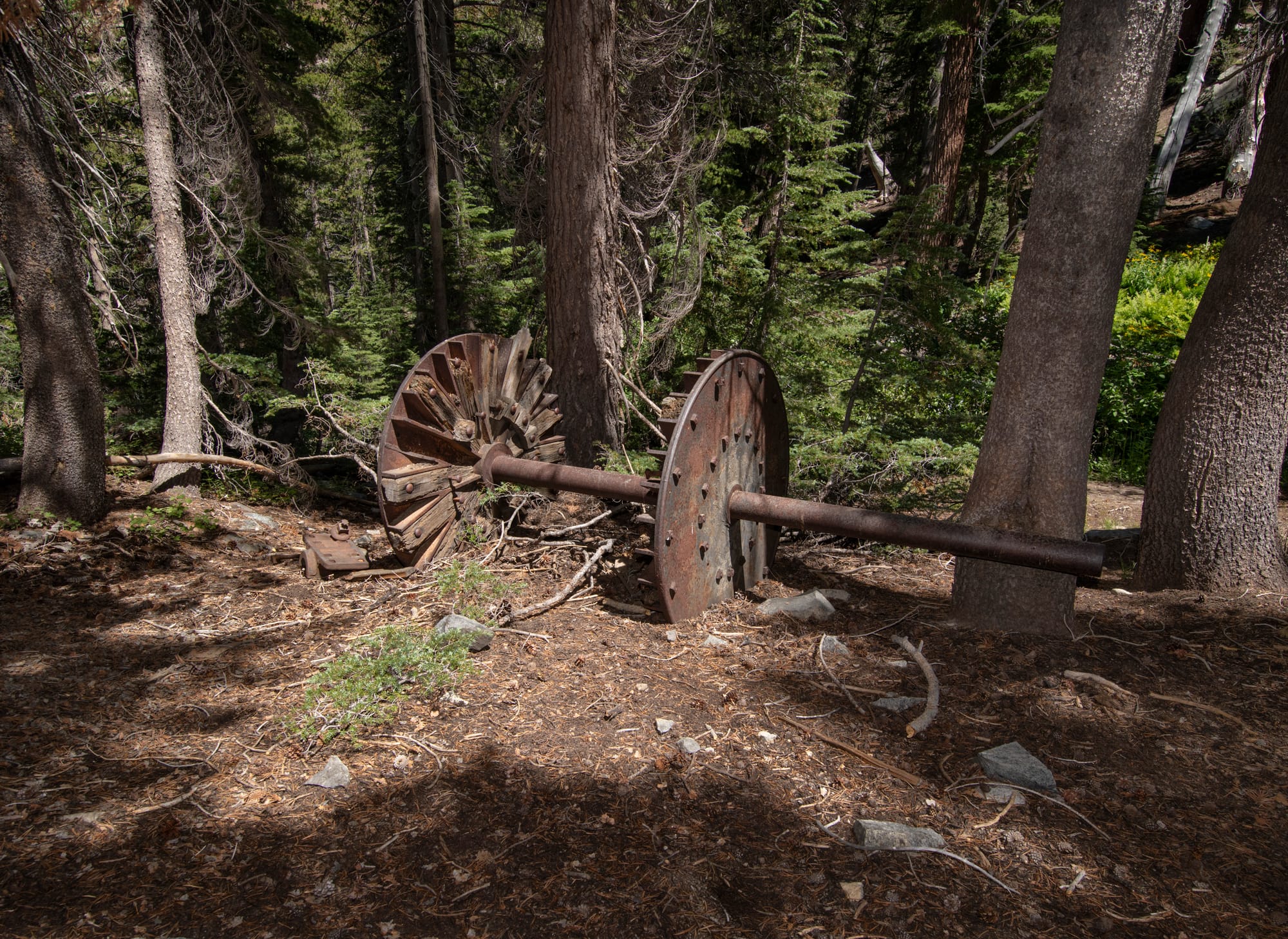 That is the sum total of what we have been able to dig up on the mill and a possible associated mine, even after talking to a local USFS archaeologist and the Southern Mono Historical Society. The two historical photos (above) appear to have been taken in the 1920s, years after the mill was abandoned. The 3-stamp Joshua Hendy stamp mill seen in the photos remains today, in fair condition, as well as part of the jaw crusher on the wooden platform. Only the stone foundation and partial walls of the cabin remain. Of the two water wheels seen in the photo (a large 20-foot model and a smaller one adjacent to it), only the hubs and belt wheels remain. A few metal water pipes and some miscellaneous metal parts lie scattered nearby.