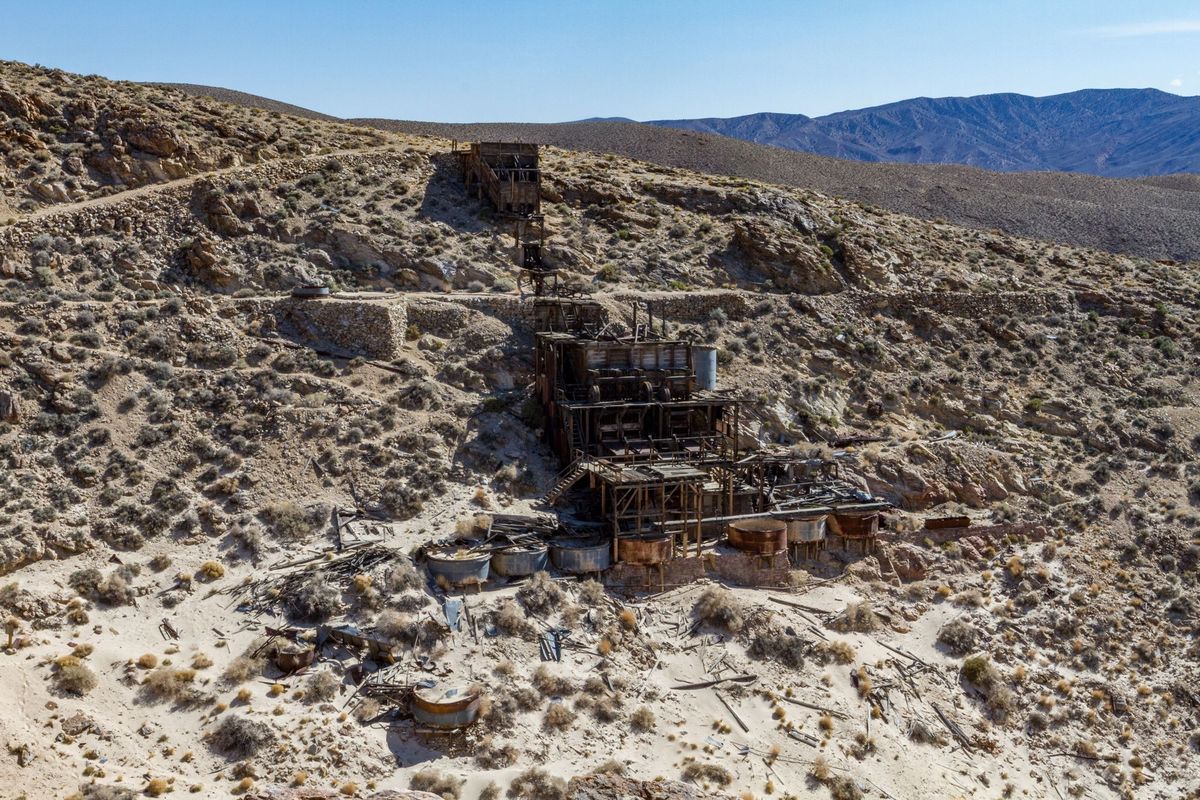 The fifteen stamp mill was quickly built in 1908 by mine developer Bob Montgomery (of Bullfrog mining and Rhyolite fame) to develop the gold ores of the Skidoo mine just behind the mill. Ore was hauled directly from the mine to the mill via tunnels in the hillside. Mr. Montgomery had significant financial backing from Charles M. Schwab (a steel magnate). A townsite sprang up a little way to the east.