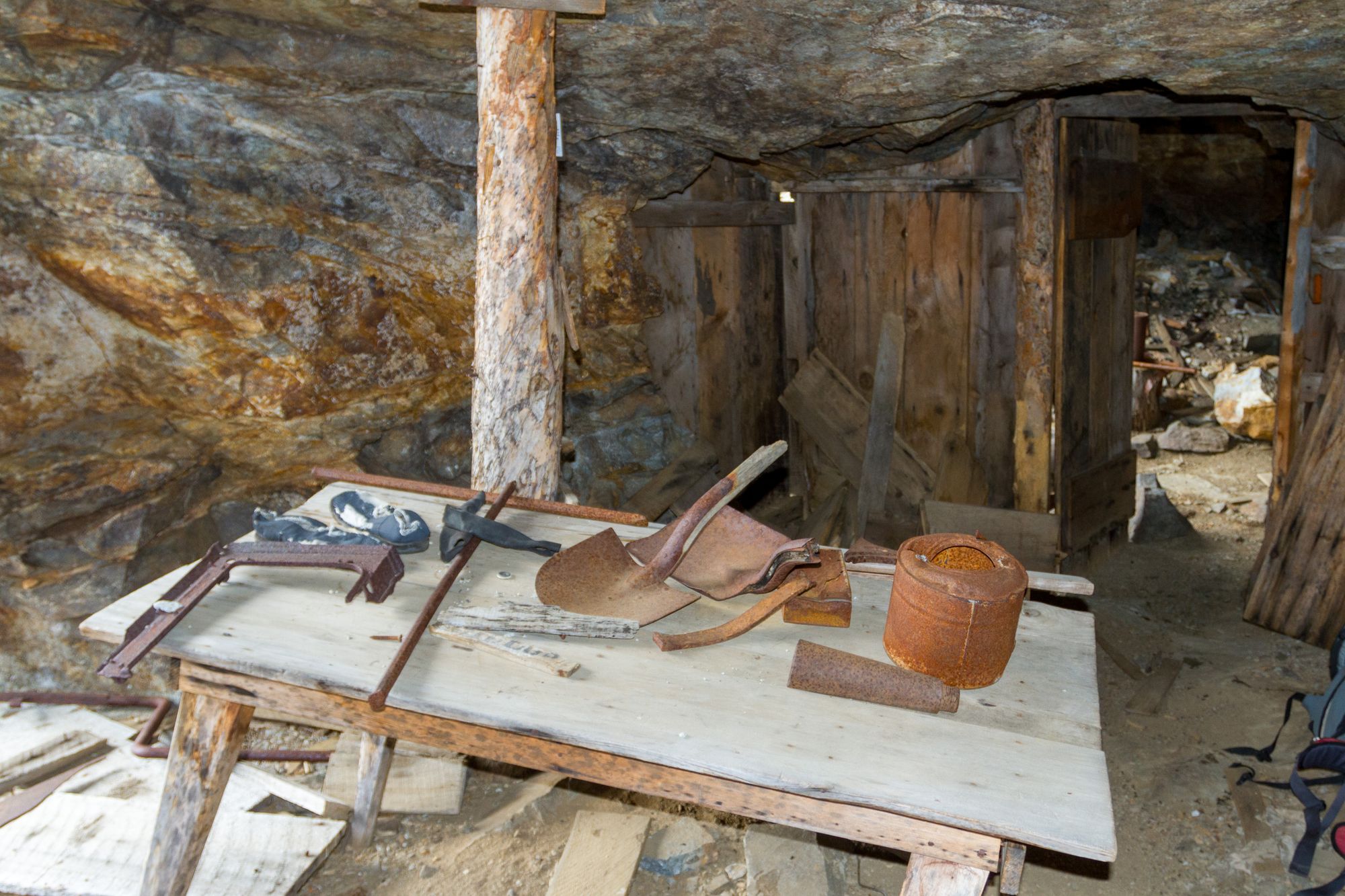 The mine contains a few relics from its operational days: old tables, chairs, pieces of a bellows, coal left over from the forge, and even the remains of two beds in a rocked-in "bedroom" area with a window overlooking Lake Canyon far below.
